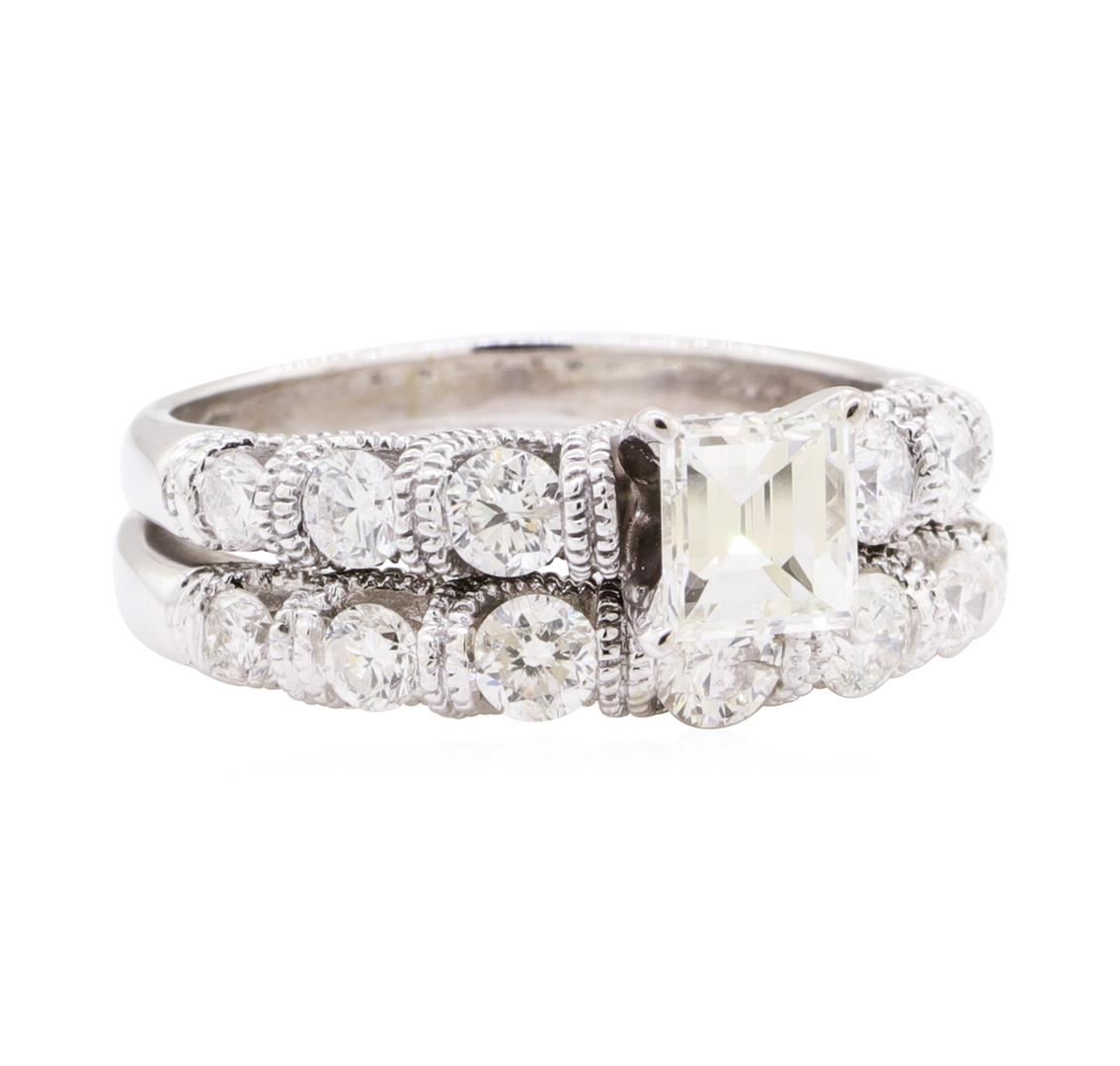 One electronically tested 14KT white gold lady's combination cast & assembled wedding ring and attached band with a bright polish with milgrain detailing finish. The featured lady's ring has double scalloped milgrain motif and a double shank measuring 4.40 millimeters wide. Identified with markings of '585'. Condition is like new, good workmanship. Containing: One prong set square cut diamond, measuring 5.15 x 4.90 x 3.04mm (depth est.) approximate weight of 0.62ct. Graded in the setting. Color G - H Clarity VS-1 Cut Good One channel set round brilliant cut diamond, measuring 3.50 - 3.45 x 2.16mm (depth est.) approximate weight of 0.16ct. Graded in the setting. Color H Clarity I-1 Cut Very Good Twelve channel set round brilliant cut diamonds, measuring 3.00 - 2.40 x 1.67mm (depth est.) approximate total weight of 12 Stones = 0.90ct. Graded in the setting. Color H - I Clarity SI-2 to I-1 Cut Good. Total Weight of Diamonds 1.68ct.. Total Weight of Ring And Attached Band 6.40gm GAS Appraised at $6355.00. GAS Appraised at $6,355.00.