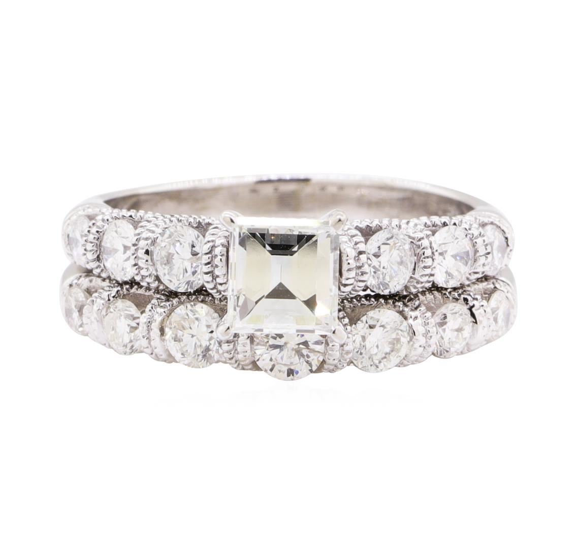 One electronically tested 14KT white gold lady's combination cast & assembled wedding ring and attached band with a bright polish with milgrain detailing finish. The featured lady's ring has double scalloped milgrain motif and a double shank measuring 4.40 millimeters wide. Identified with markings of '585'. Condition is like new, good workmanship. Containing: One prong set square cut diamond, measuring 5.15 x 4.90 x 3.04mm (depth est.) approximate weight of 0.62ct. Graded in the setting. Color G - H Clarity VS-1 Cut Good One channel set round brilliant cut diamond, measuring 3.50 - 3.45 x 2.16mm (depth est.) approximate weight of 0.16ct. Graded in the setting. Color H Clarity I-1 Cut Very Good Twelve channel set round brilliant cut diamonds, measuring 3.00 - 2.40 x 1.67mm (depth est.) approximate total weight of 12 Stones = 0.90ct. Graded in the setting. Color H - I Clarity SI-2 to I-1 Cut Good. Total Weight of Diamonds 1.68ct.. Total Weight of Ring And Attached Band 6.40gm GAS Appraised at $6355.00. GAS Appraised at $6,355.00.