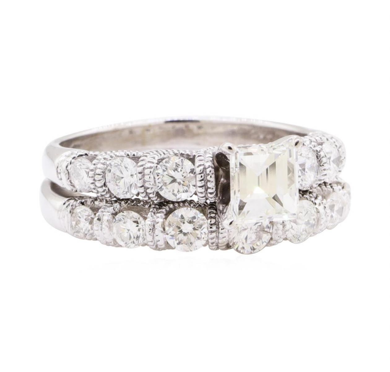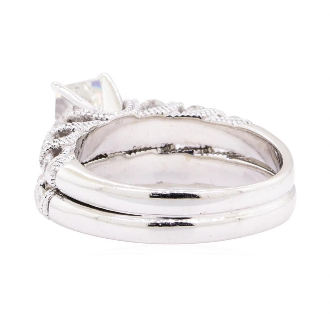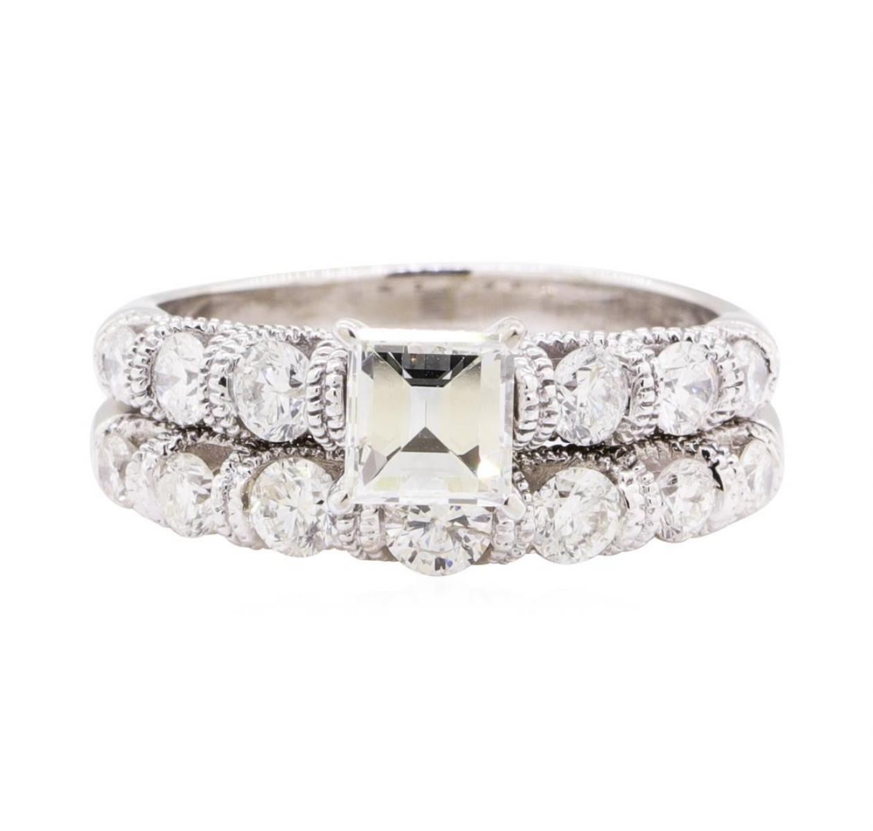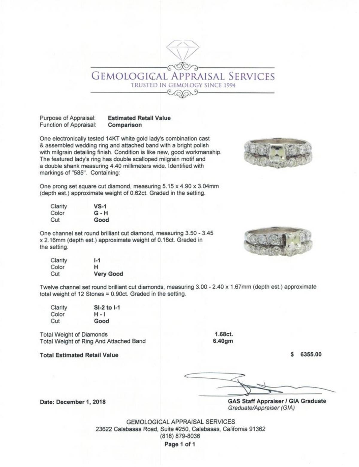 One electronically tested 14KT white gold lady's combination cast & assembled wedding ring and attached band with a bright polish with milgrain detailing finish. The featured lady's ring has double scalloped milgrain motif and a double shank measuring 4.40 millimeters wide. Identified with markings of '585'. Condition is like new, good workmanship. Containing: One prong set square cut diamond, measuring 5.15 x 4.90 x 3.04mm (depth est.) approximate weight of 0.62ct. Graded in the setting. Color G - H Clarity VS-1 Cut Good One channel set round brilliant cut diamond, measuring 3.50 - 3.45 x 2.16mm (depth est.) approximate weight of 0.16ct. Graded in the setting. Color H Clarity I-1 Cut Very Good Twelve channel set round brilliant cut diamonds, measuring 3.00 - 2.40 x 1.67mm (depth est.) approximate total weight of 12 Stones = 0.90 ct. Graded in the setting. Color H - I Clarity SI-2 to I-1 Cut Good. Total Weight of Diamonds 1.68ct.. Total Weight of Ring And Attached Band 6.40gm GAS Appraised at $6355.00. GAS Appraised.