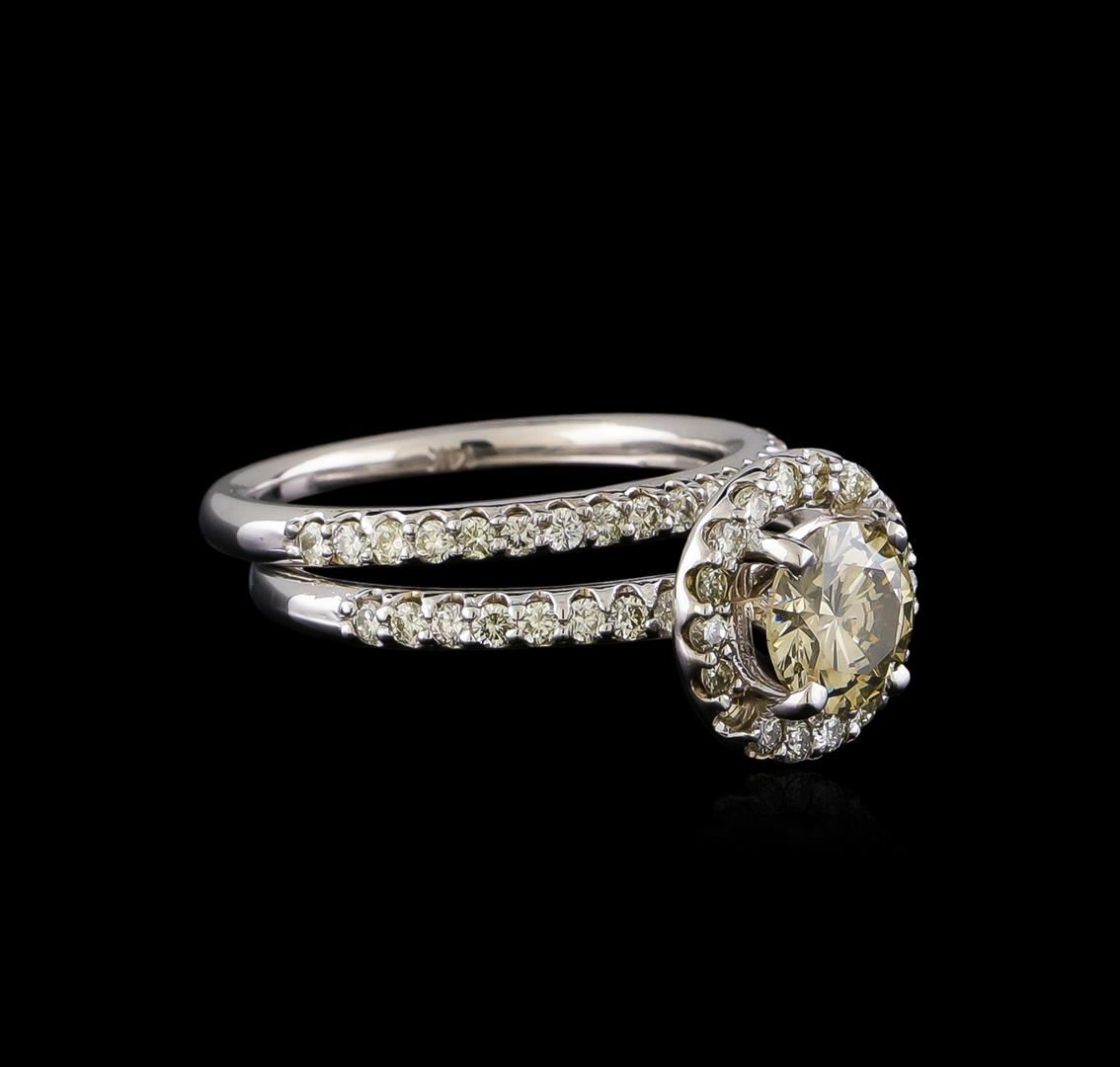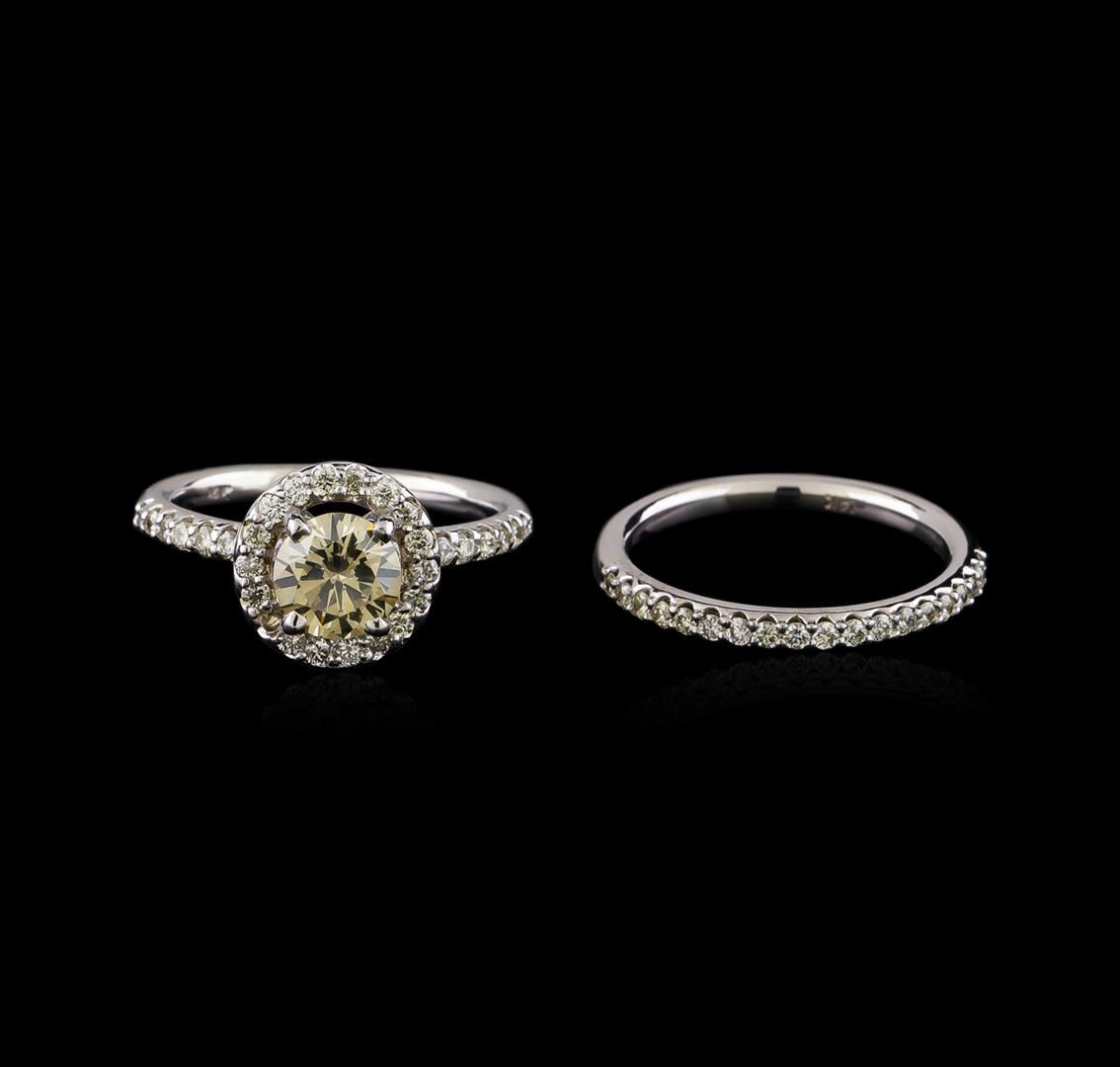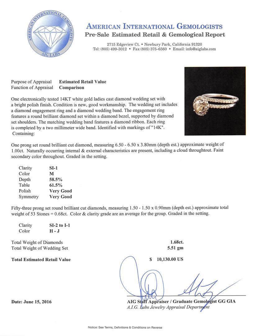 One electronically tested 14KT white gold ladies cast diamond wedding set with a bright polish finish. Condition is new, good workmanship. The wedding set includes a diamond engagement ring and a diamond wedding band. The engagement ring features a round brilliant diamond set within a diamond bezel, supported by diamond set shoulders. The matching wedding band features a diamond ribbon. Each ring is completed by a two millimeter wide band. Identified with markings of "14K". Containing: One prong set round brilliant cut diamond, measuring 6.50 - 6.50 x 3.80mm (depth est.) approximate weight of 1.00ct. Naturally occurring internal & external characteristics are present, including a cloud throughout. Faint secondary color throughout. Graded in the setting: Clarity: SI-1. Color: M. Depth: 58.5%. Table: 61.5%. Polish: Very Good. Symmetry: Very Good. Fifty-three prong set round brilliant cut diamonds, measuring 1.50 -1.50 x 0.90mm (depth est.) approximate total weight of 53 Stones = 0.68ct. Color & clarity grade are an average for the group. Graded in the setting: Clarity: SI-2 to I-1. Color: H-J. Total Weight of Diamonds: 1.68ct. Total Weight of Wedding Set: 5.51 gm. AIG Appraised at $10,130.00.