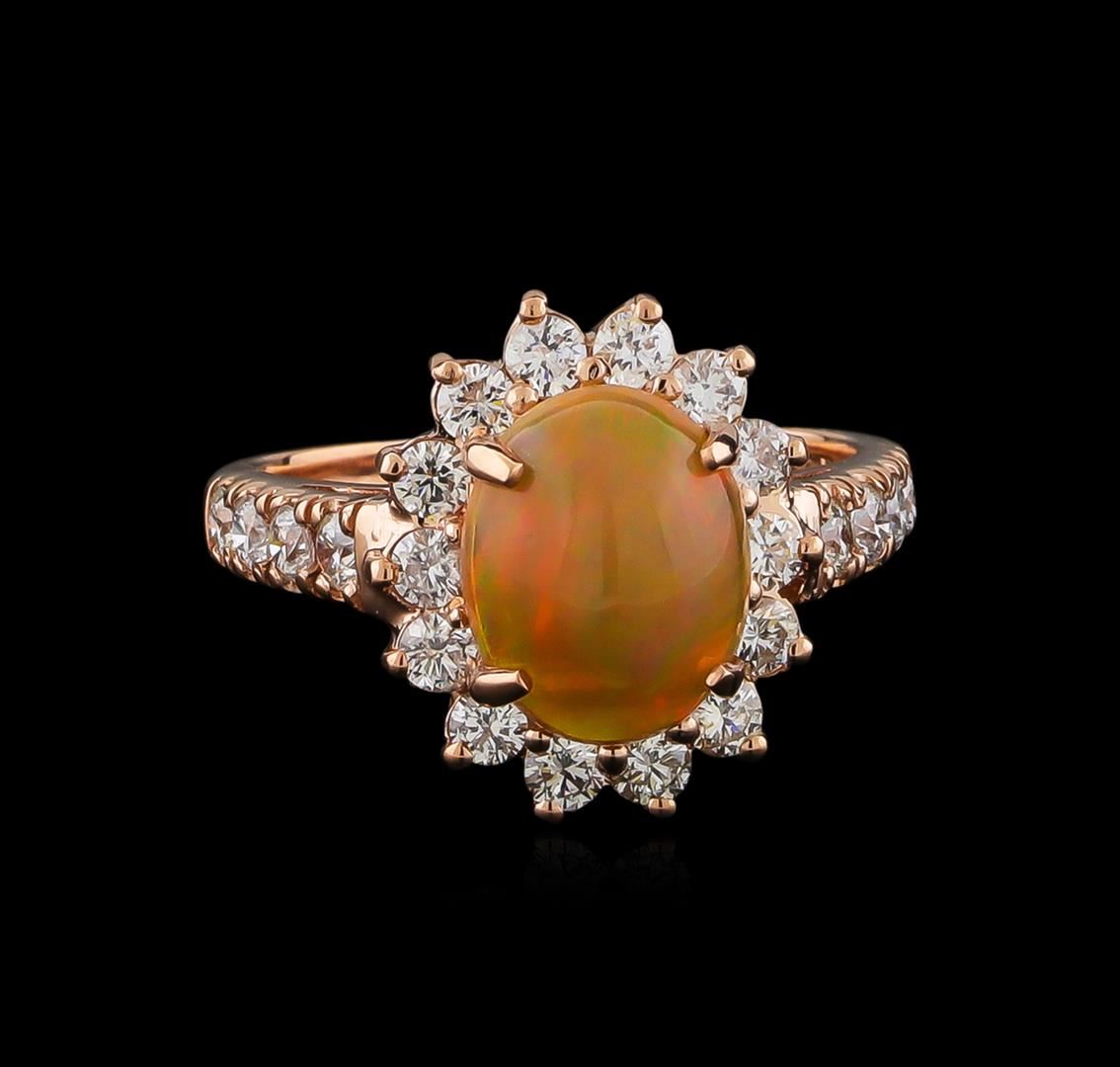 One electronically tested 14KT rose gold lady's cast fashion ring with a basket halo with a bright polish finish. The featured lady's ring has a shank measuring 1.85 millimeters wide. Identified with markings of "K14". Condition is new, good workmanship. Containing: One orange opal that is cut in a oval shaped cabochon and is prong set, measuring 10.08 mm long x 8.09 mm wide, and 4.49 mm thick and the approximate weight is 1.68 carats. The opal has a somewhat bright, orange-green play of color (fire) in a rolling flashfire pattern; a medium dome; a good cut; no inclusions; consistent in its brightness and pattern; and is not directional. Graded in the setting. Twenty-Two prong set round brilliant cut diamonds, measuring 2.30 - 2.25 x 1.41mm (depth est.) approximate total weight of 22 Stones = 0.98ct. Graded in the setting. Clarity: SI-1 to I-1. Color: G - Very Good. Total Weight of Diamonds 0.98ct. Total Weight of Opals 1.68ct. Total Weight of Ring 4.70gm. GAS Appraised at $3,530.00.