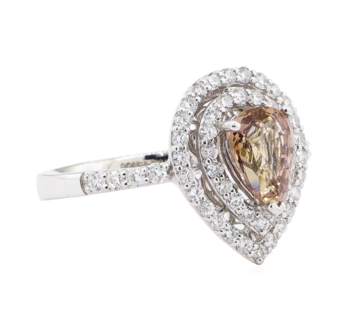 One electronically tested platinum ladies cast & assembled pink sapphire and diamond ring. The featured pink sapphire is set within tiered diamond bezels supported by an elaborate lattice under gallery and diamond ribbon shoulders, completed by a two millimeter wide band. Bright polish finish. Trademark is Orianne. Identified with markings of "PT950". Condition is new, good workmanship. Containing: One prong set pear modified mixed cut natural pink sapphire, measuring 8.18 x 6.07 x 4.14mm, exact weight 1.68ct., type II Clarity is eye clean, medium, slightly grayish, brownish, pink color, (GIA brPi 5/2), cut is good. Transmitting light with no distortion, transparent. No indications of heating (NTE). GIA Gemological Report attached. Graded loose prior to setting in the GIA Laboratory, Report #2175461260. Fifty-Two prong set round brilliant cut diamonds exact total weight 52 Stones = 0.63ct. The clarity grade reflects the overall average for the group. Graded in the setting. Clarity SI-2 to I-1 Color F - G Total Weight of Colored Stones 1.68 ct. Total Weight of Diamonds 0.63 ct. Total Weight of Ring 5.60 gm Estimated Retail Value $ 8,210.00 US