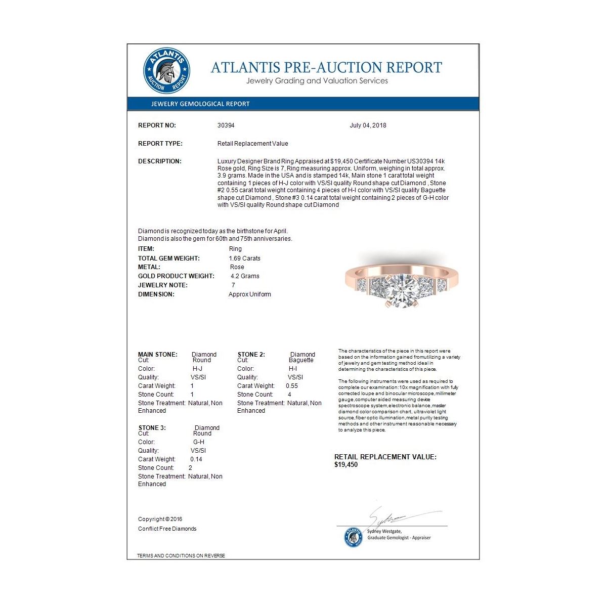 REF-392A8X -30394 ---- 1.69 CTW Certified VS/SI Diamond Solitaire Ring 14K Rose Gold ---- Luxury Designer Brand Ring Appraised at $19,450 Certificate Number US30394 14k Rose gold, Ring Size is 7, Ring measuring approx. Uniform, weighing in total approx. 3.9 grams. Made in the USA and is stamped 14k, Main stone 1 carat total weight containing 1 pieces of H-J color with VS/SI quality Round shape cut Diamond , Stone #2 0.55 carat total weight containing 4 pieces of H-I color with VS/SI quality Baguette shape cut Diamond , Stone #3 0.14 carat total weight containing 2 pieces of G-H color with VS/SI quality Round shape cut Diamond
