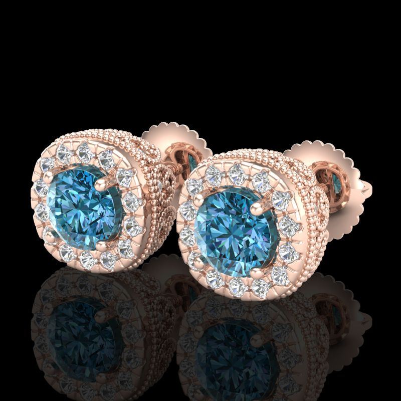 REF-176N4Y -37993 ---- 1.69 CTW Fancy Intense Blue Diamond Art Deco Stud Earrings 18K Rose Gold ---- Luxury Designer Brand Earring Appraised at $10,650 Certificate Number US37993 18k Rose gold, Earring Size is Larger, Earring measuring approx. Uniform, weighing in total approx. 4.2 grams. Made in the USA and is stamped 18k, Main stone 1.12 carat total weight containing 2 pieces of Intense Fancy Blue color with SI quality Round shape cut Diamond , Stone #2 0.57 carat total weight containing 48 pieces of H-I color with VS/SI quality Round shape cut Diamond