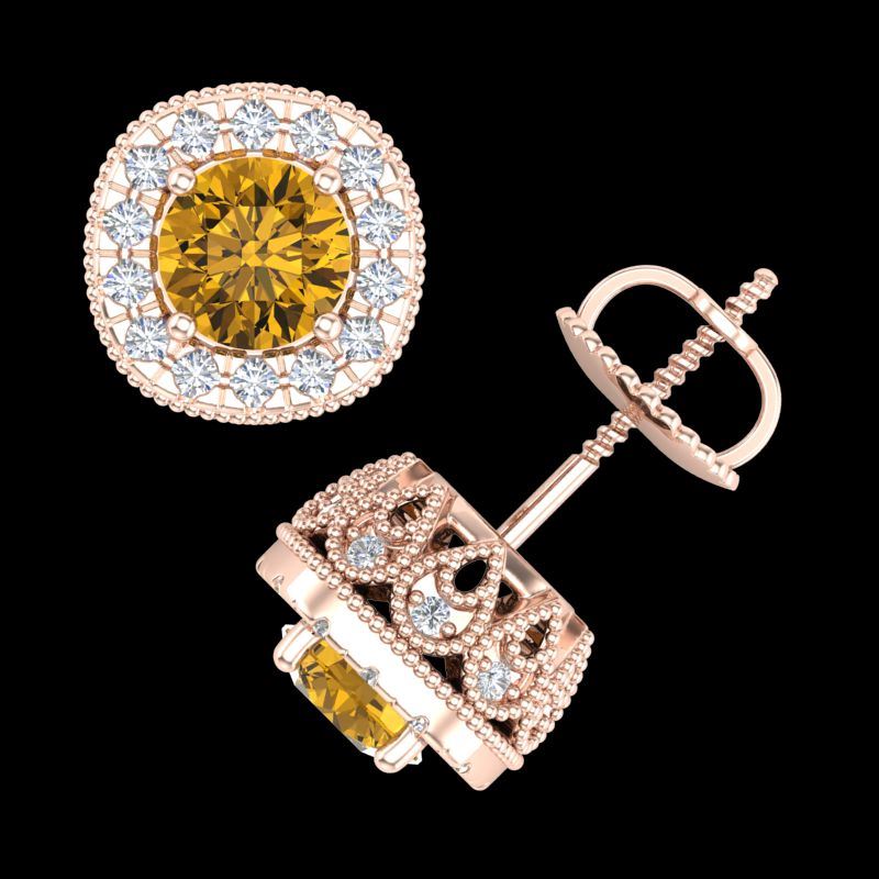 REF-254X5T -37995 ---- 1.69 CTW Intense Fancy Yellow Diamond Art Deco Stud Earrings 18K Rose Gold ---- Luxury Designer Brand Earring Appraised at $16,800 Certificate Number US37995 18k Rose gold, Earring Size is Larger, Earring measuring approx. Uniform, weighing in total approx. 4.2 grams. Made in the USA and is stamped 18k, Main stone 1.12 carat total weight containing 2 pieces of Intense Fancy Yellow color with SI quality Round shape cut Diamond , Stone #2 0.57 carat total weight containing 48 pieces of H-I color with VS/SI quality Round shape cut Diamond