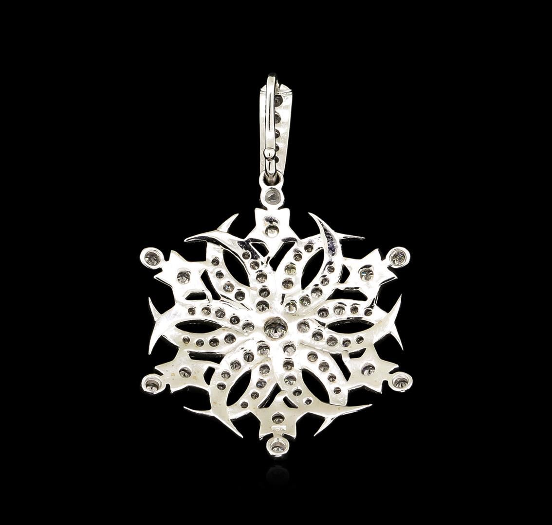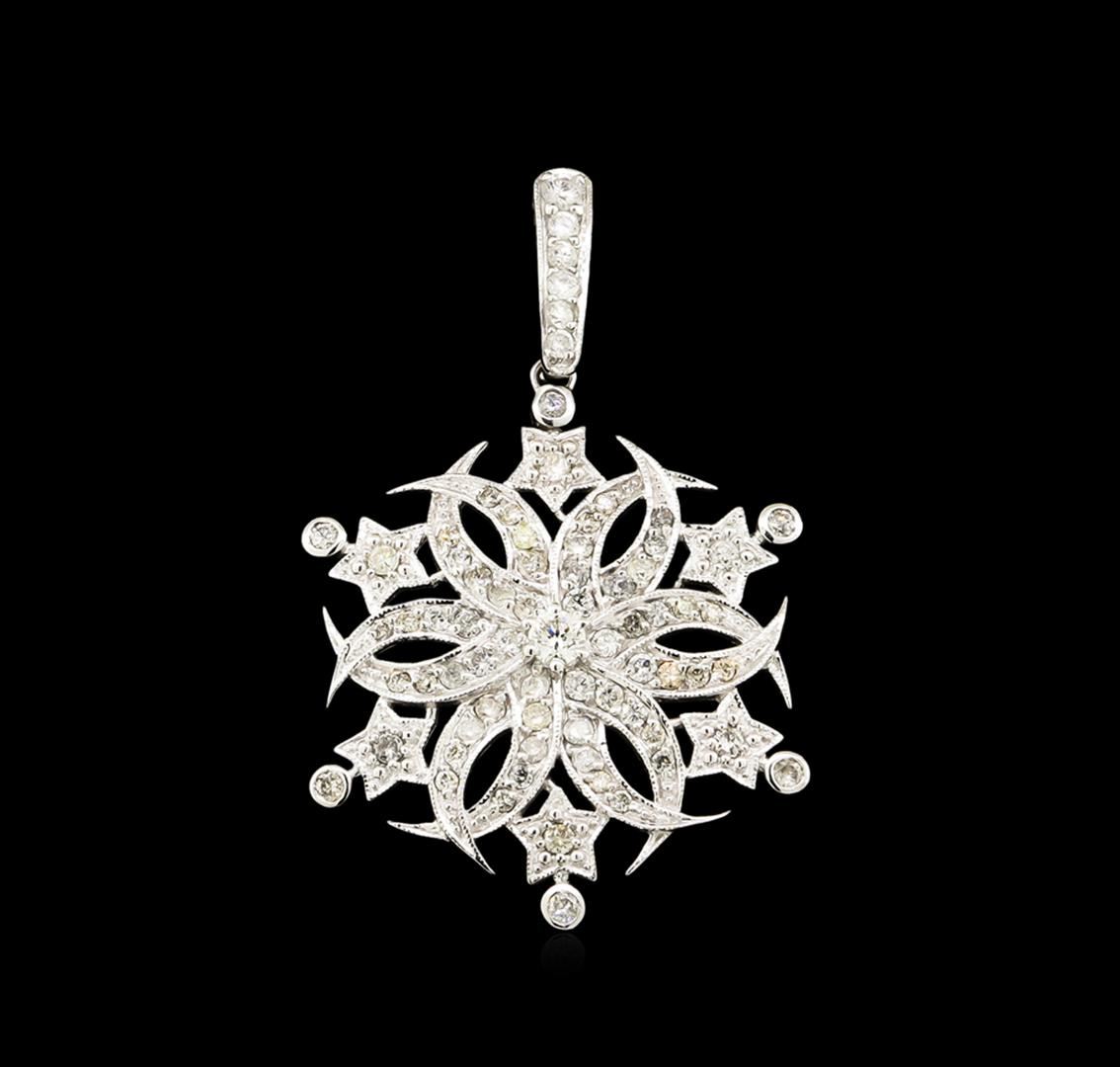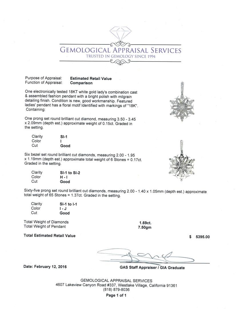 One electronically tested 18KT white gold lady's combination cast & assembled fashion pendant with a bright polish with milgrain detailing finish. Featured ladies' pendant has a floral motif Identified with markings of "18K". Condition is new, good workmanship. Containing: One prong set round brilliant cut diamond, measuring 3.50 - 3.45 x 2.09mm (depth est.) approximate weight of 0.15ct. Graded in the setting. Clarity: SI-1. Color: I. Cut Good Six bezel set round brilliant cut diamonds, measuring 2.00 - 1.95 x 1.19mm (depth est.) approximate total weight of 6 Stones = 0.17ct. Graded in the setting. Clarity: SI-1 to SI-2. Color: H - I. Cut Good Sixty-Five prong set round brilliant cut diamonds, measuring 2.00 - 1.40 x 1.05mm (depth est.) approximate total weight of 65 Stones = 1.37ct. Graded in the setting. Clarity: SI-1 to I-1. Color: I - Good. Total Weight of Diamonds 1.69ct. Total Weight of Pendant 7.50gm. GAS Appraised at $7,285.00.