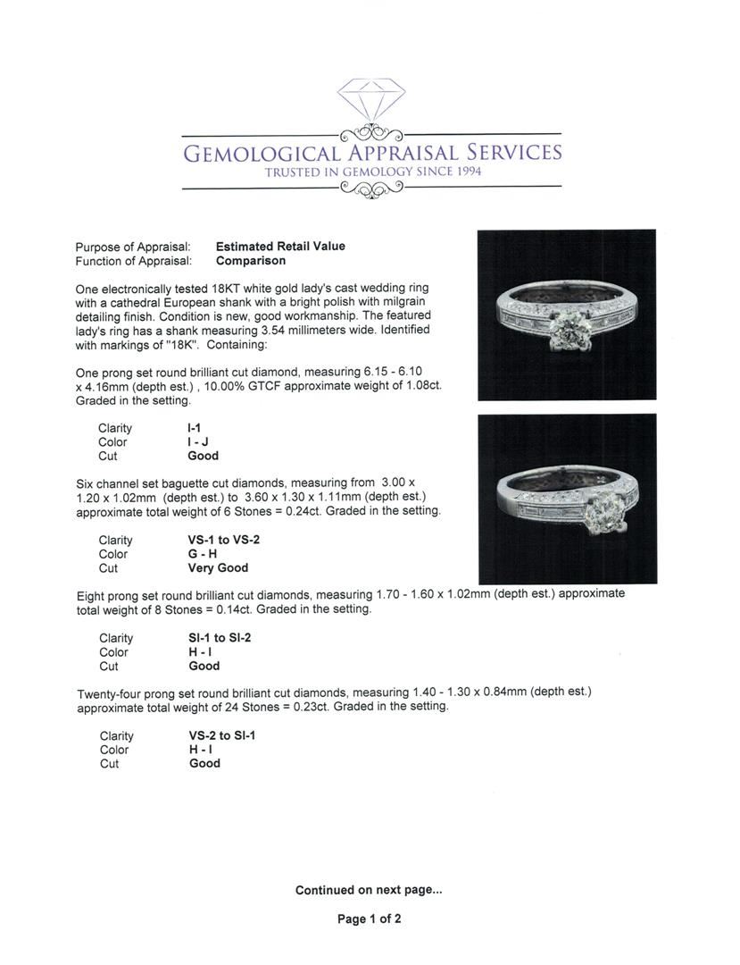 One electronically tested 18KT white gold lady's cast wedding ring with a cathedral European shank with a bright polish with milgrain detailing finish. The featured lady's ring has a shank measuring 3.54 millimeters wide. Identified with markings of '18K'. Condition is new, good workmanship. Containing: One prong set round brilliant cut diamond, measuring 6.15 - 6.10 x 4.16mm (depth est.) , 10.00.%. GTCF approximate weight of 1.08ct. Graded in the setting. Clarity I-1. Color: I - J Cut Good Six channel set baguette cut diamonds, measuring from 3.00 x 1.20 x 1.02mm (depth est.) to 3.60 x 1.30 x 1.11mm (depth est.) approximate total weight of 6 Stones = 0.24ct. Graded in the setting. Clarity VS-1 to VS-2. Color: G - H Cut Very Good Eight prong set round brilliant cut diamonds, measuring 1.70 - 1.60 x 1.02mm (depth est.) approximate total weight of 8 Stones = 0.14ct. Graded in the setting. Clarity SI-1 to SI-2. Color: H - I Cut Good Twenty-Four prong set round brilliant cut diamonds, measuring 1.40 - 1.30 x 0.84mm (depth est.) approximate total weight of 24 Stones = 0.23ct. Graded in the setting. Clarity VS-2 to SI-1. Color: H - I Cut Good. Total Weight of Diamonds 1.69ct.. Total Weight of Ring 6.40gm. GAS Appraised at $12,535.00.
