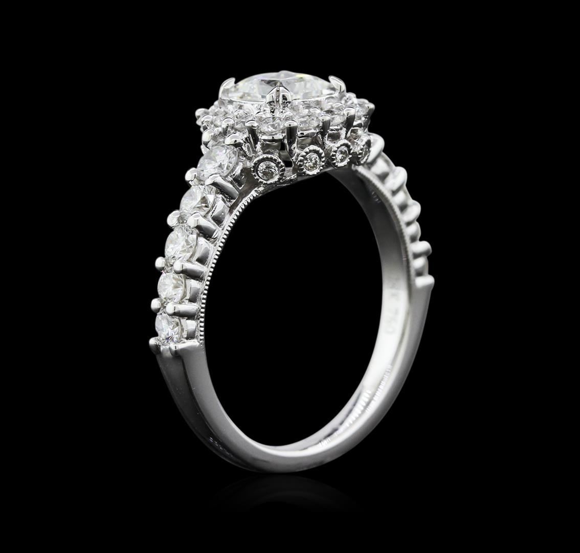 One electronically tested 18KT white gold ladies cast diamond engagement ring with a bright polish finish. Identified with markings of "18K". Condition is new. Containing: One prong set radiant shaped cut diamond, measuring 5.50 x 4.50 x 3.38mm (depth est.) approximate weight of 0.69ct. Clarity: SI-2. Color: J, Cut is Good. Ten prong set round brilliant cut diamonds, measuring 2.50 - 2.50 x 1.50mm (depth est.) approximate total weight of 10 Stones = 0.57ct. Clarity: SI-1 to I-1. Color: H - I, Cut is Good. Twenty-Four prong set round brilliant cut diamonds, measuring 1.70 - 1.70 x 1.02mm (depth est.) approximate total weight of 24 Stones = 0.43ct. Clarity: SI-1. Color: H - I, Cut is Good. Diamonds are graded in the mounting, unless otherwise stated. Total Weight of Diamonds 1.69ct. Total Weight of Engagement Ring 5.20gm. GGL Appraised at $4,020.00.
