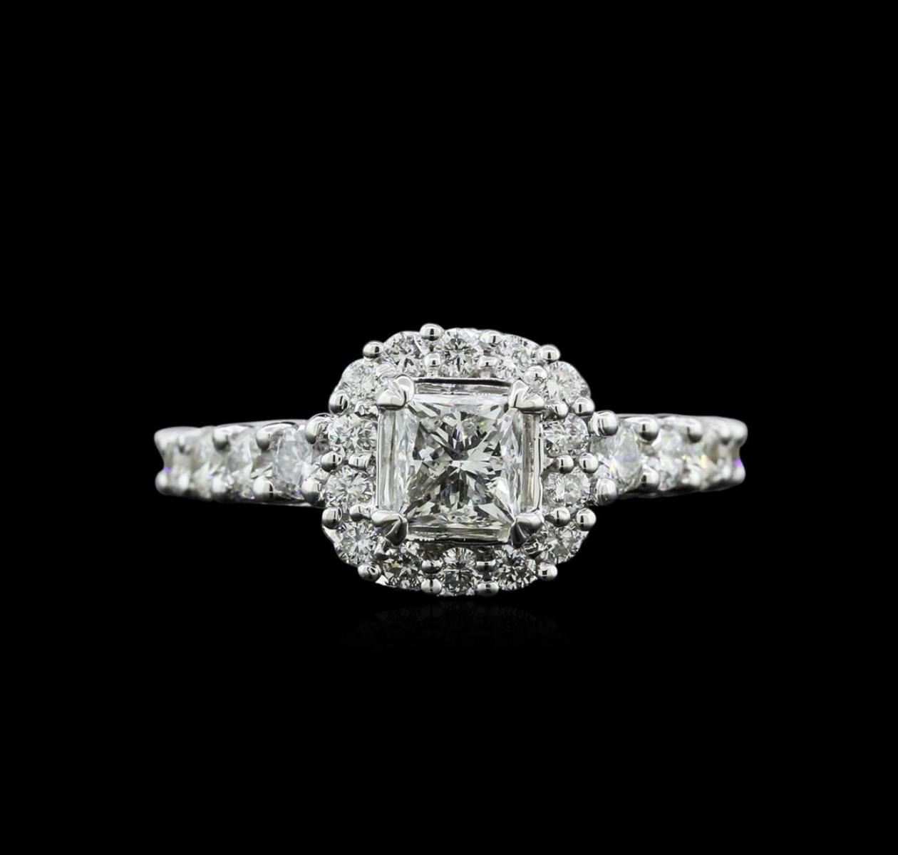 One electronically tested 18KT white gold ladies cast diamond engagement ring with a bright polish finish. Identified with markings of "18K". Condition is new. Containing: One prong set radiant shaped cut diamond, measuring 5.50 x 4.50 x 3.38mm (depth est.) approximate weight of 0.69ct. Clarity: SI-2. Color: J, Cut is Good. Ten prong set round brilliant cut diamonds, measuring 2.50 - 2.50 x 1.50mm (depth est.) approximate total weight of 10 Stones = 0.57ct. Clarity: SI-1 to I-1. Color: H - I, Cut is Good. Twenty-Four prong set round brilliant cut diamonds, measuring 1.70 - 1.70 x 1.02mm (depth est.) approximate total weight of 24 Stones = 0.43ct. Clarity: SI-1. Color: H - I, Cut is Good. Diamonds are graded in the mounting, unless otherwise stated. Total Weight of Diamonds 1.69ct. Total Weight of Engagement Ring 5.20gm. GGL Appraised at $4,020.00.