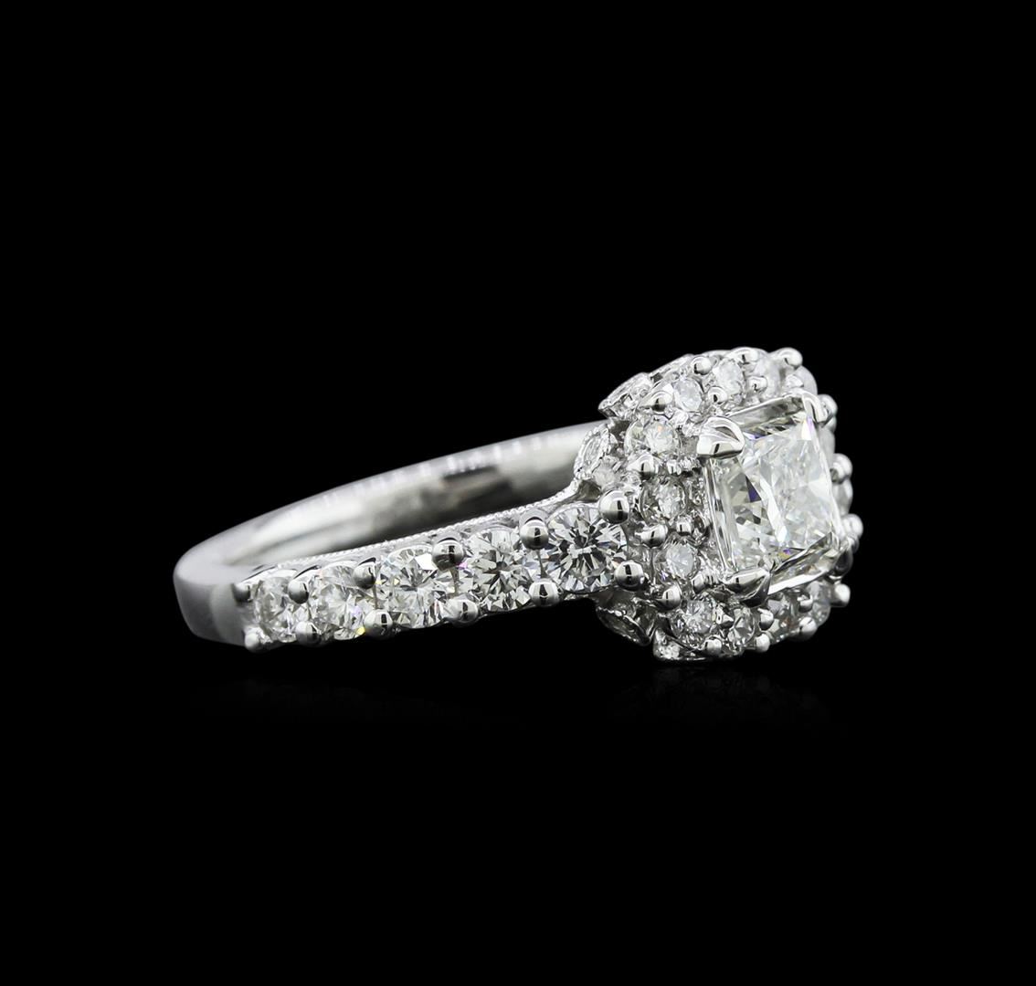 One electronically tested 18KT white gold ladies cast diamond engagement ring with a bright polish finish. Identified with markings of "18K". Condition is new. Containing: One prong set radiant shaped cut diamond, measuring 5.50 x 4.50 x 3.38mm (depth est.) approximate weight of 0.69ct. Clarity: SI-2. Color: J, Cut is Good. Ten prong set round brilliant cut diamonds, measuring 2.50 - 2.50 x 1.50mm (depth est.) approximate total weight of 10 Stones = 0.57ct. Clarity: SI-1 to I-1. Color: H - I, Cut is Good. Twenty-Four prong set round brilliant cut diamonds, measuring 1.70 - 1.70 x 1.02mm (depth est.) approximate total weight of 24 Stones = 0.43ct. Clarity: SI-1. Color: H - I, Cut is Good. Diamonds are graded in the mounting, unless otherwise stated. Total Weight of Diamonds 1.69ct. Total Weight of Engagement Ring 5.20gm. GGL Appraised.