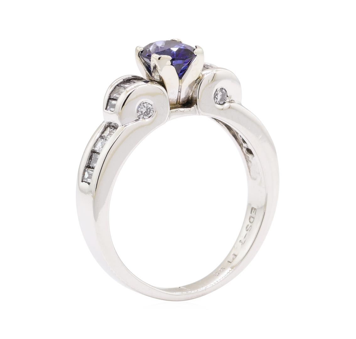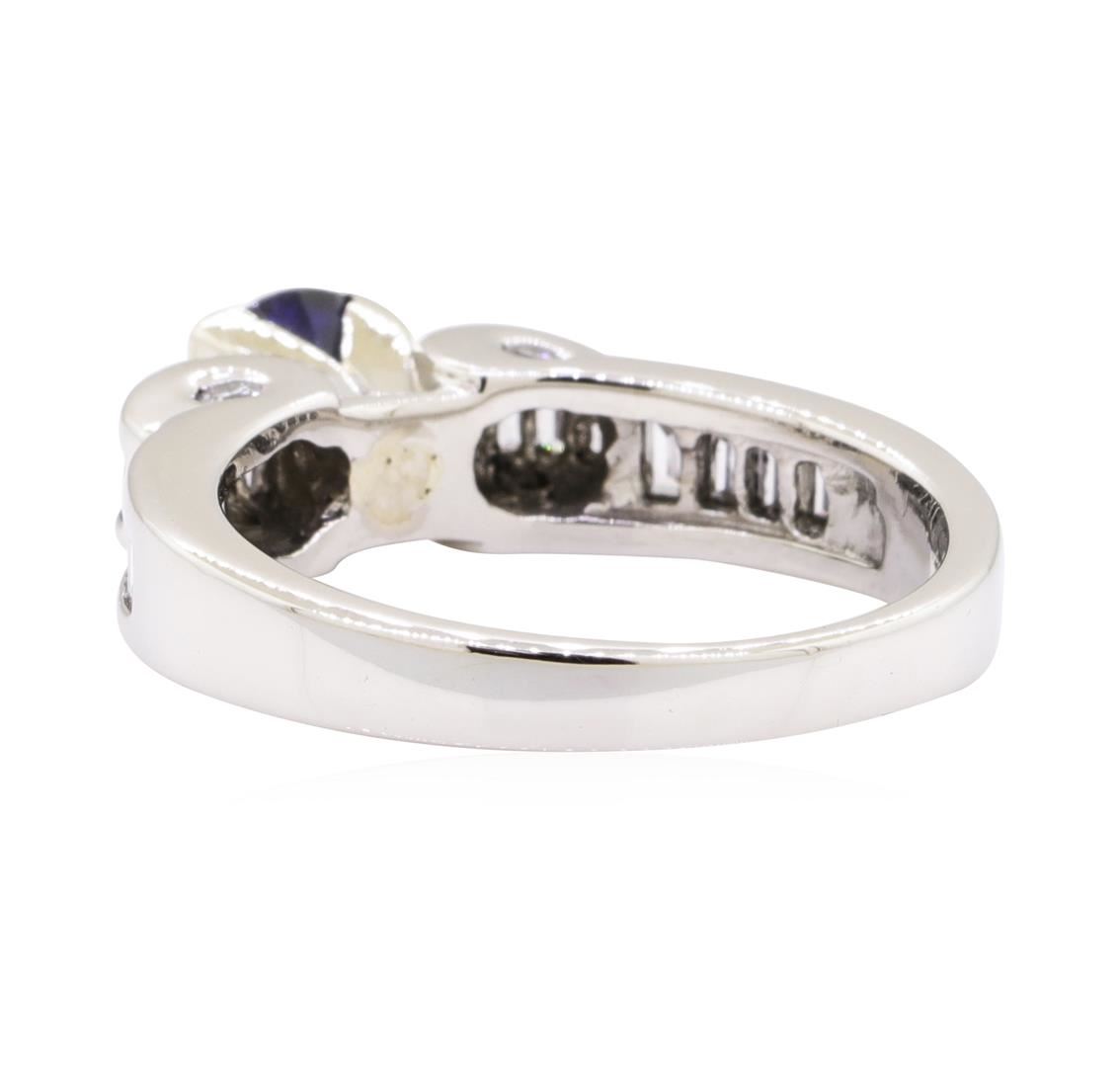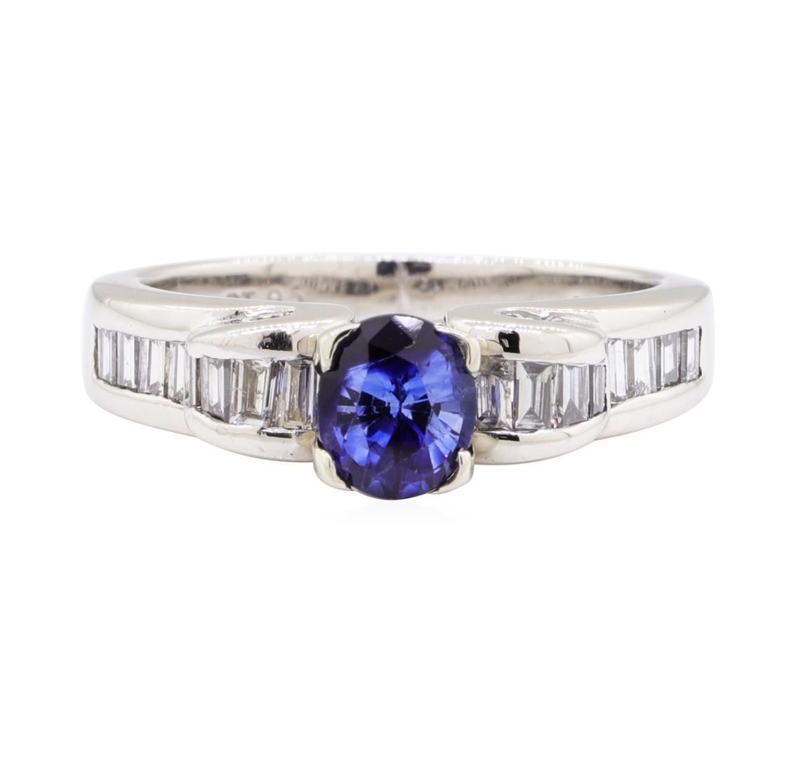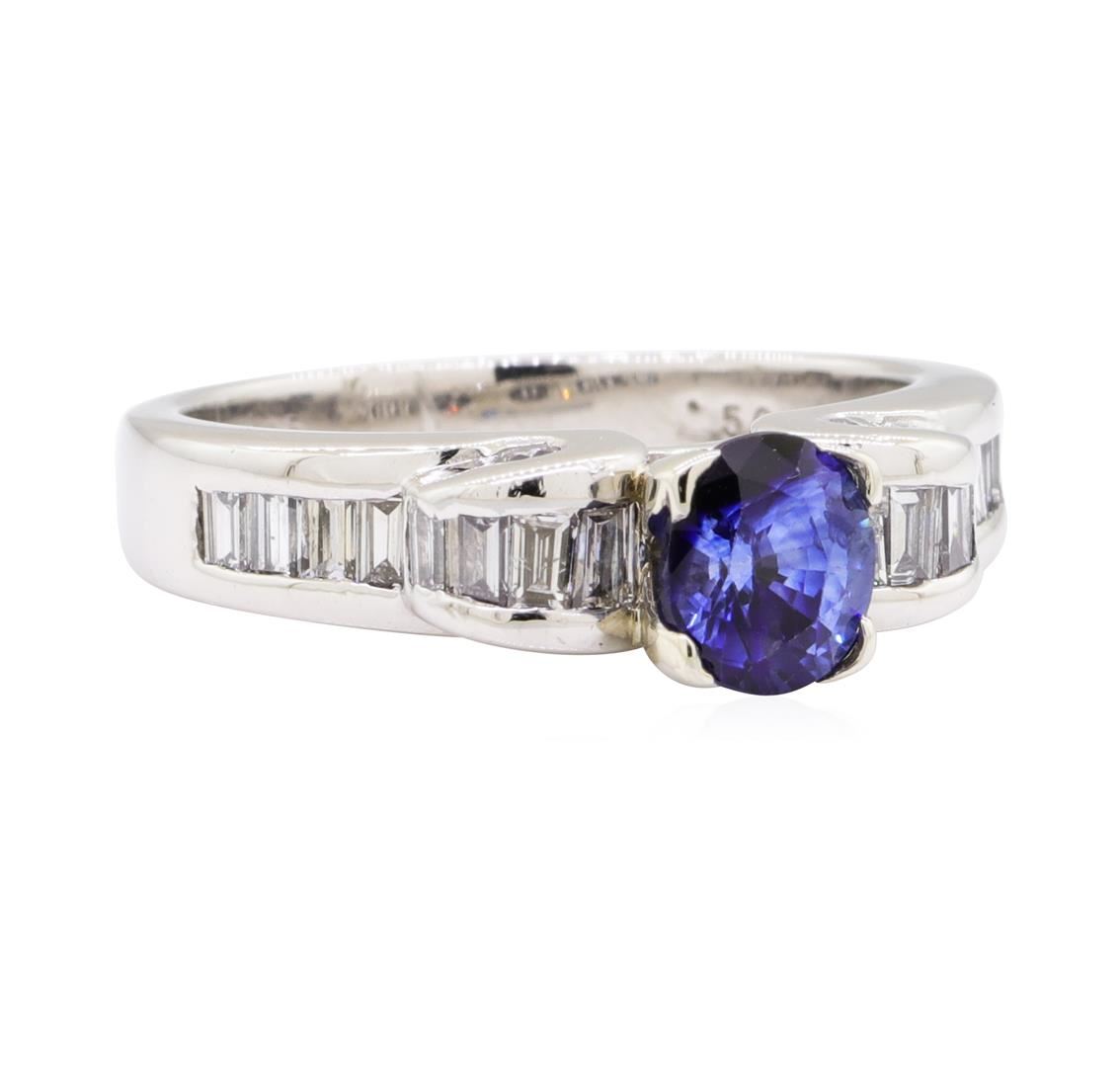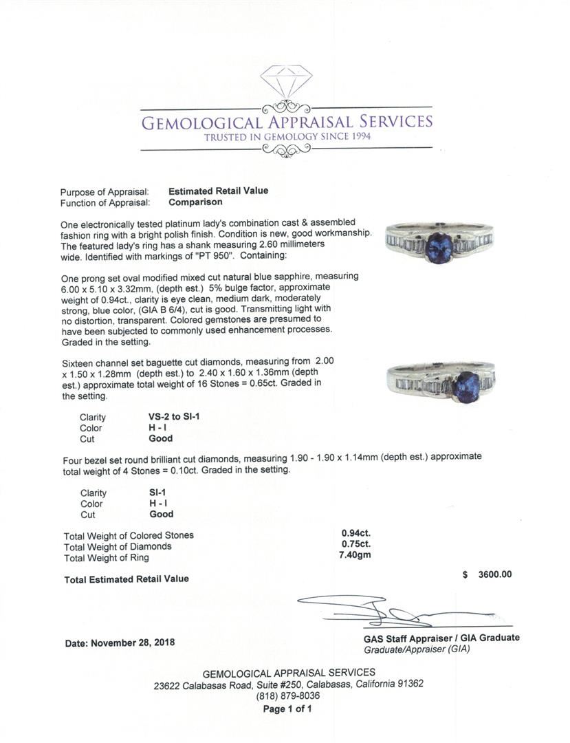 One electronically tested platinum lady's combination cast & assembled fashion ring with a bright polish finish. The featured lady's ring has a shank measuring 2.60 millimeters wide. Identified with markings of 'PT 950'. Condition is new, good workmanship. Containing: One prong set oval modified mixed cut natural blue sapphire, measuring 6.00 x 5.10 x 3.32mm, (depth est.) 5%. bulge factor, approximate weight of 0.94ct., clarity is eye clean, medium dark, moderately strong, blue color, (GIA B 6/4), cut is good. Transmitting light with no distortion, transparent. Colored gemstones are presumed to have been subjected to commonly used enhancement processes. Graded in the setting. Sixteen channel set baguette cut diamonds, measuring from 2.00 x 1.50 x 1.28mm (depth est.) to 2.40 x 1.60 x 1.36mm (depth est.) approximate total weight of 16 Stones = 0.65ct. Graded in the setting. Color H - I Clarity VS-2 to SI-1 Cut Good Four bezel set round brilliant cut diamonds, measuring 1.90 - 1.90 x 1.14mm (depth est.) approximate total weight of 4 Stones = 0.10ct. Graded in the setting. Color H - I Clarity SI-1 Cut Good. Total Weight of Colored Stones 0.94ct.. Total Weight of Diamonds 0.75ct.. Total Weight of Ring 7.40gm GAS Appraised at $3600.00. GAS Appraised at $3,600.00.