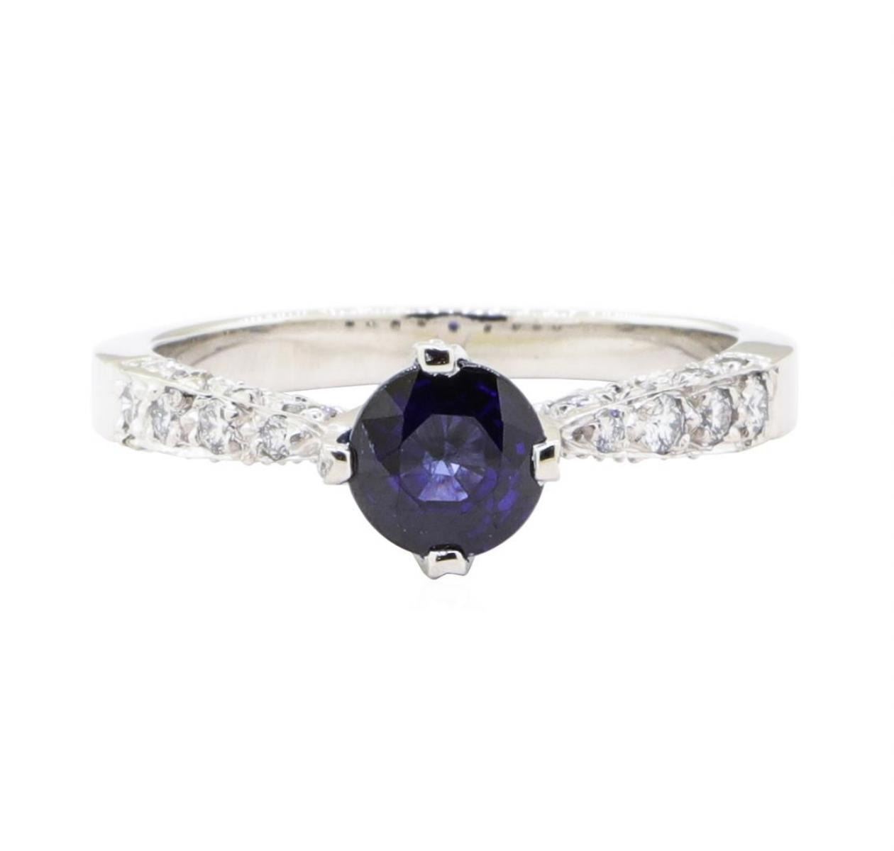 One electronically tested platinum lady's cast fashion ring with a pinched cathedral shank with a bright polish finish. The featured lady's ring has a shank measuring 2.30 millimeters wide. Identified with markings of 'PLAT'. Condition is new, good workmanship. Containing: One prong set round modified mixed cut natural blue sapphire, measuring 5.96 - 5.93 x 3.87 mm, (depth est.) approximate weight of 1.09ct., clarity is eye clean, medium dark, strong, blue color, (GIA B 6/5), cut is very good. Transmitting light with no distortion, transparent. Colored gemstones are presumed to have been subjected to commonly used enhancement processes. Graded in the setting. Thirty prong set round brilliant cut diamonds, measuring 1.80 - 1.40 x 0.99mm (depth est.) approximate total weight of 30 Stones = 0.60 ct. Graded in the setting. Color F - G Clarity VS-1 to VS-2 Cut Very Good. Total Weight of Colored Stones 1.09ct.. Total Weight of Diamonds 0.60 ct.. Total Weight of Ring 5.80gm GAS Appraised at  $4695.00. GAS Appraised.