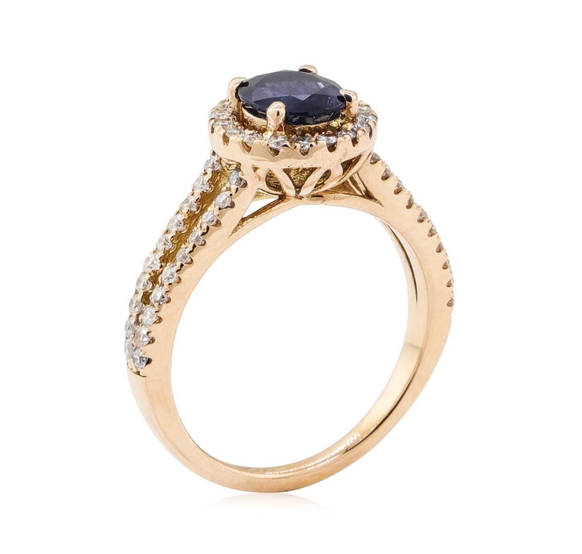 One electronically tested 14KT rose gold lady's cast fashion ring with a split shank halo with a bright polish finish. The featured lady's ring has a shank measuring 1.70 millimeters wide. Identified with markings of '14K'. Condition is new. Containing: One prong set oval modified mixed cut natural blue sapphire, measuring 7.04 x 5.90 x 3.20mm, (depth est.) approximate weight of 1.14ct., clarity is heavily included, medium dark, very slightly grayish, blue color, (GIA B 6/3), cut is good. Transmitting light somewhat diffusely, semi-transparent to translucent. Indications of laboratory high temperature heat treatment, with glass & flux additives. Colored gemstones are presumed to have been subjected to commonly used enhancement processes. Graded in the setting. Fifty-Eight prong set round brilliant cut diamonds, measuring 1.40 - 1.30 x 0.84mm (depth est.) approximate total weight of 58 Stones = 0.55ct. Graded in the setting. Color G - H Clarity VS-2 to SI-1 Cut Very Good. Total Weight of Colored Stones 1.14ct.. Total Weight of Diamonds 0.55ct.. Total Weight of Ring 4.50gm GAS Appraised at $3405.00. GAS Appraised.