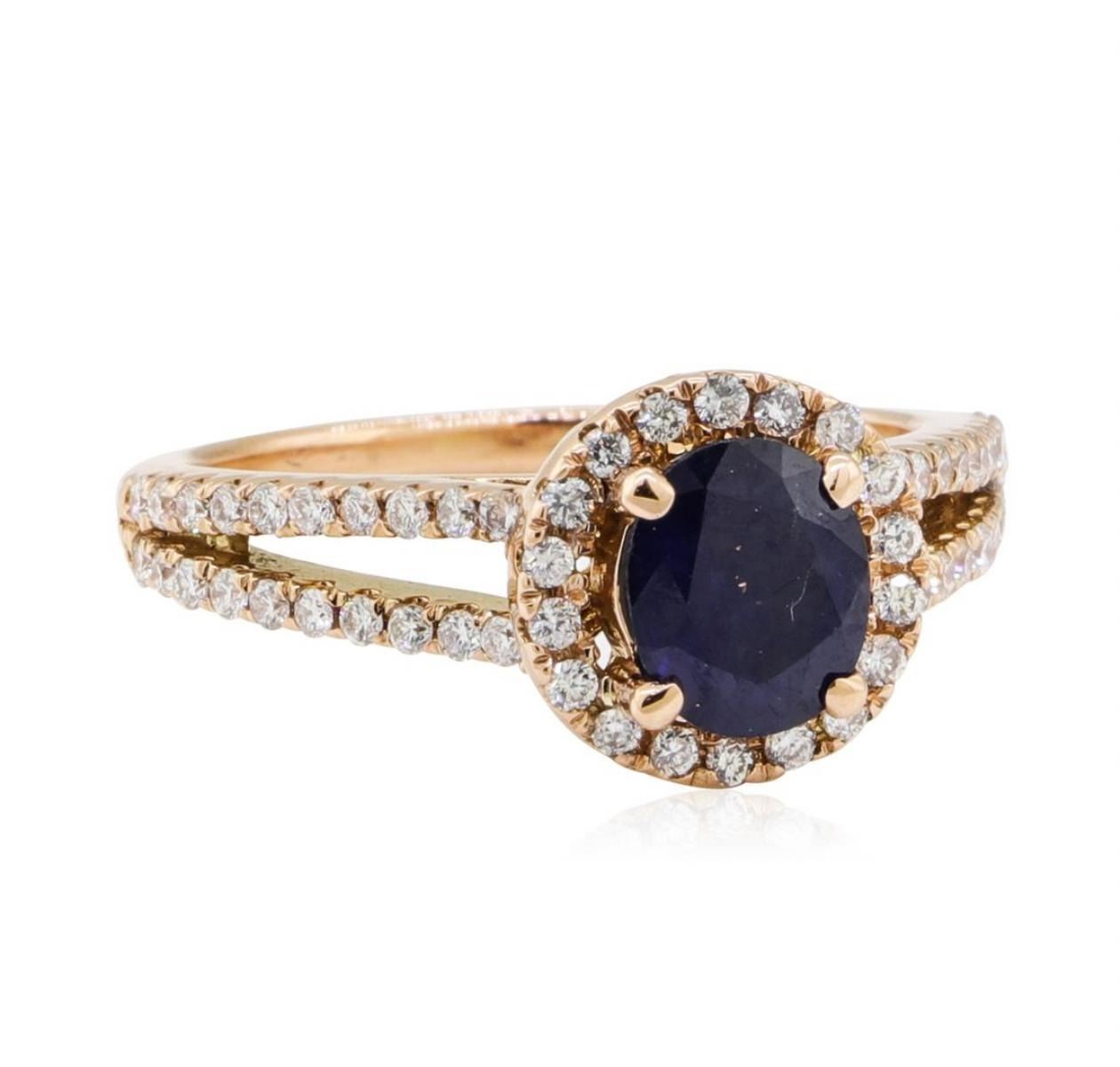 One electronically tested 14KT rose gold lady's cast fashion ring with a split shank halo with a bright polish finish. The featured lady's ring has a shank measuring 1.70 millimeters wide. Identified with markings of '14K'. Condition is new. Containing: One prong set oval modified mixed cut natural blue sapphire, measuring 7.04 x 5.90 x 3.20mm, (depth est.) approximate weight of 1.14ct., clarity is heavily included, medium dark, very slightly grayish, blue color, (GIA B 6/3), cut is good. Transmitting light somewhat diffusely, semi-transparent to translucent. Indications of laboratory high temperature heat treatment, with glass & flux additives. Colored gemstones are presumed to have been subjected to commonly used enhancement processes. Graded in the setting. Fifty-Eight prong set round brilliant cut diamonds, measuring 1.40 - 1.30 x 0.84mm (depth est.) approximate total weight of 58 Stones = 0.55ct. Graded in the setting. Color G - H Clarity VS-2 to SI-1 Cut Very Good. Total Weight of Colored Stones 1.14ct.. Total Weight of Diamonds 0.55ct.. Total Weight of Ring 4.50gm GAS Appraised at $3405.00. GAS Appraised.