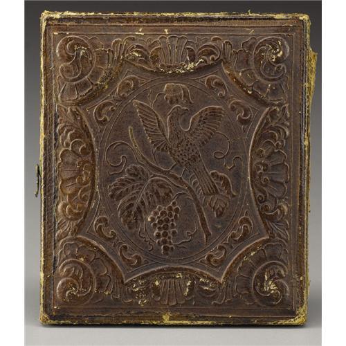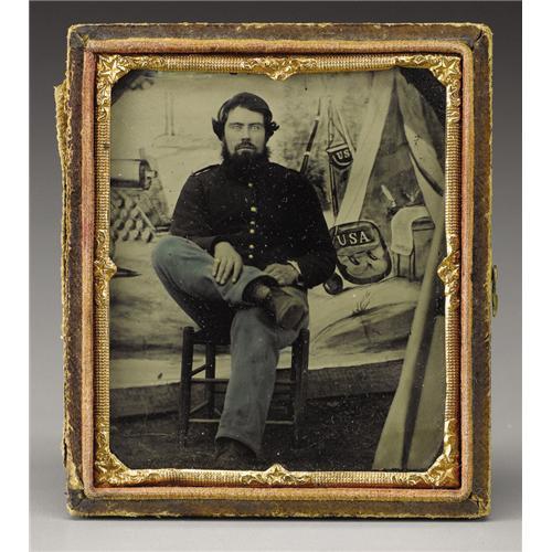 <B>1/6th Plate Tintype of Seated Union Private Before the Benton Barracks Backdrop.</B></I> An exquisite and accurately hand-tinted tintype of an unidentified Union private. The tinting of the uniform is so well done that it almost looks like a color photograph. The background is purported to be one found at Benton Barracks located just outside St. Louis, Missouri. The image is exceptionally clear and is complete with original gilt brass frame and housed in the lower portion of a leather case (top portion missing).<BR><BR><b>Shipping:</b> Miscellaneous Collectibles, Smal (<a target="_blank" href="http://www.heritageauctions.com/common/shipping.php">view shipping information</a>)