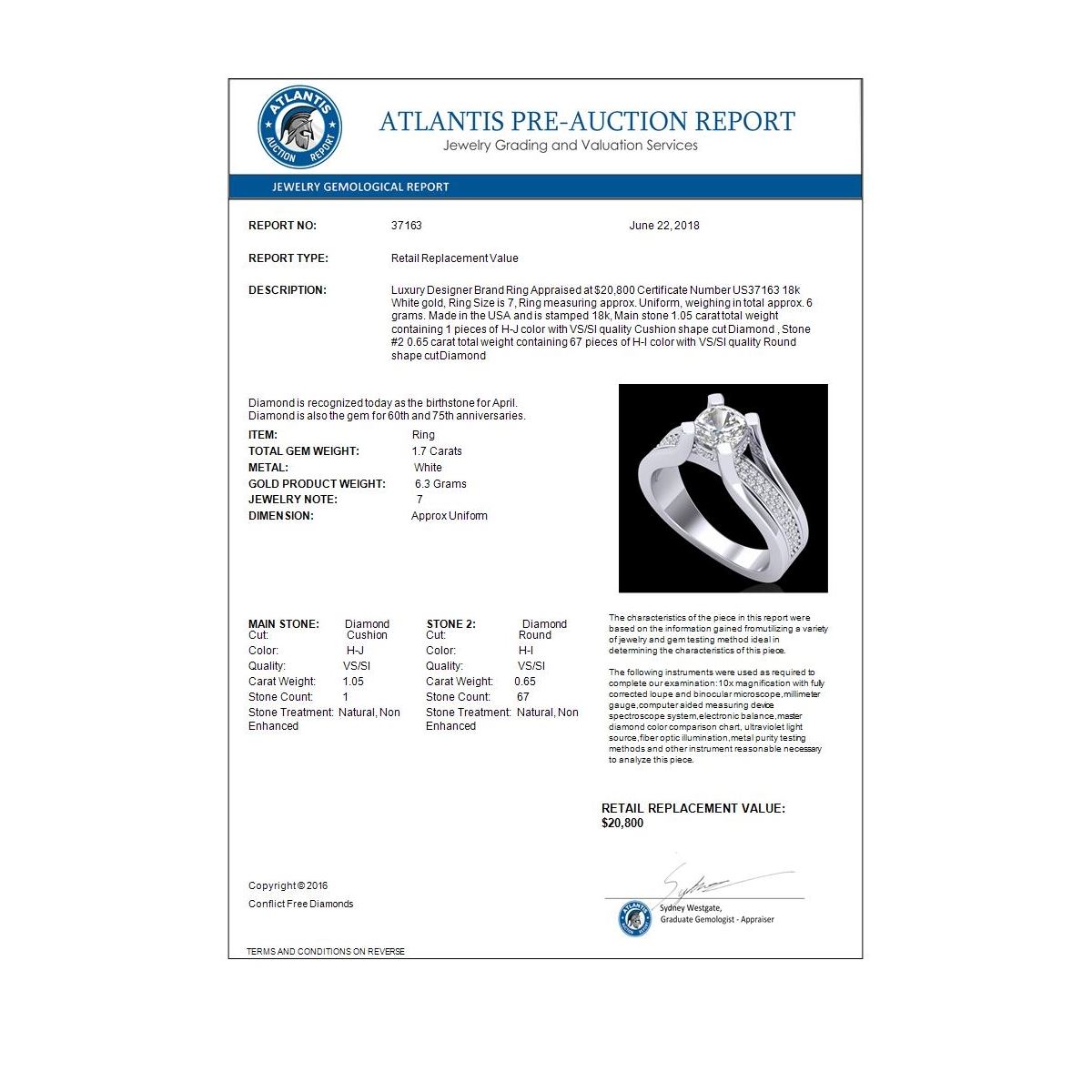 REF-472H8A -37163 ---- 1.7 CTW Cushion VS/SI Diamond Solitaire Micro Pave Ring 18K White Gold ---- Luxury Designer Brand Ring Appraised at $20,800 Certificate Number US37163 18k White gold, Ring Size is 7, Ring measuring approx. Uniform, weighing in total approx. 6 grams. Made in the USA and is stamped 18k, Main stone 1.05 carat total weight containing 1 pieces of H-J color with VS/SI quality Cushion shape cut Diamond , Stone #2 0.65 carat total weight containing 67 pieces of H-I color with VS/SI quality Round shape cut Diamond