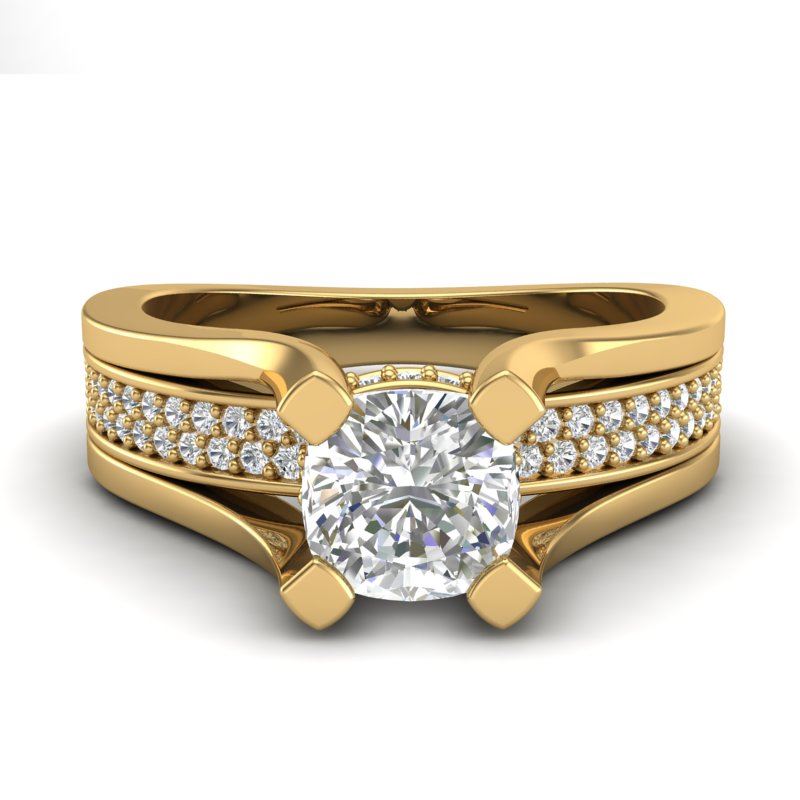 1.7 CTW Cushion VS/SI Diamond Solitaire Micro Pave Ring 18K Yellow Gold ---- Luxury Designer Brand Ring Appraised Retail Price at $20,800 ---- SKU Number US37165 18k Yellow gold Ring Size is 7, Ring measuring approx. Uniform, weighing in total approx. 12 grams. Made in the USA and is stamped 18k, Main stone 1.05 carat total weight containing 1 pieces of H-J color with VS/SI quality Cushion shape cut Diamond , Stone #2 0.65 carat total weight containing 67 pieces of H-I color with VS/SI quality Round shape cut