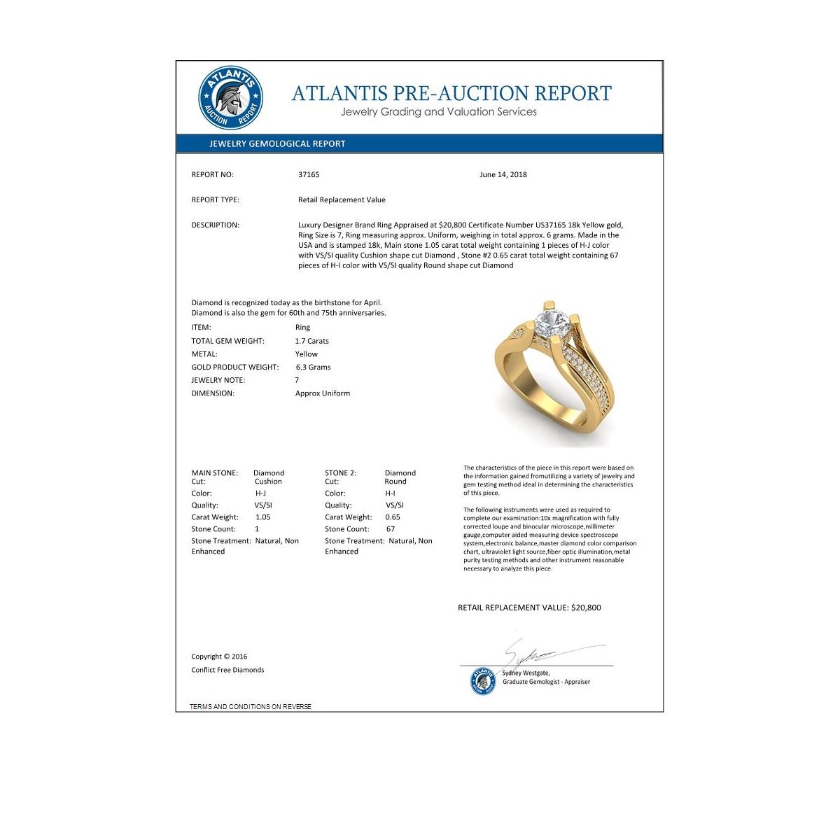 REF-472Y8K -37165 ---- 1.7 CTW Cushion VS/SI Diamond Solitaire Micro Pave Ring 18K Yellow Gold ---- Luxury Designer Brand Ring Appraised at $20,800 Certificate Number US37165 18k Yellow gold, Ring Size is 7, Ring measuring approx. Uniform, weighing in total approx. 6 grams. Made in the USA and is stamped 18k, Main stone 1.05 carat total weight containing 1 pieces of H-J color with VS/SI quality Cushion shape cut Diamond , Stone #2 0.65 carat total weight containing 67 pieces of H-I color with VS/SI quality Round shape cut Diamond