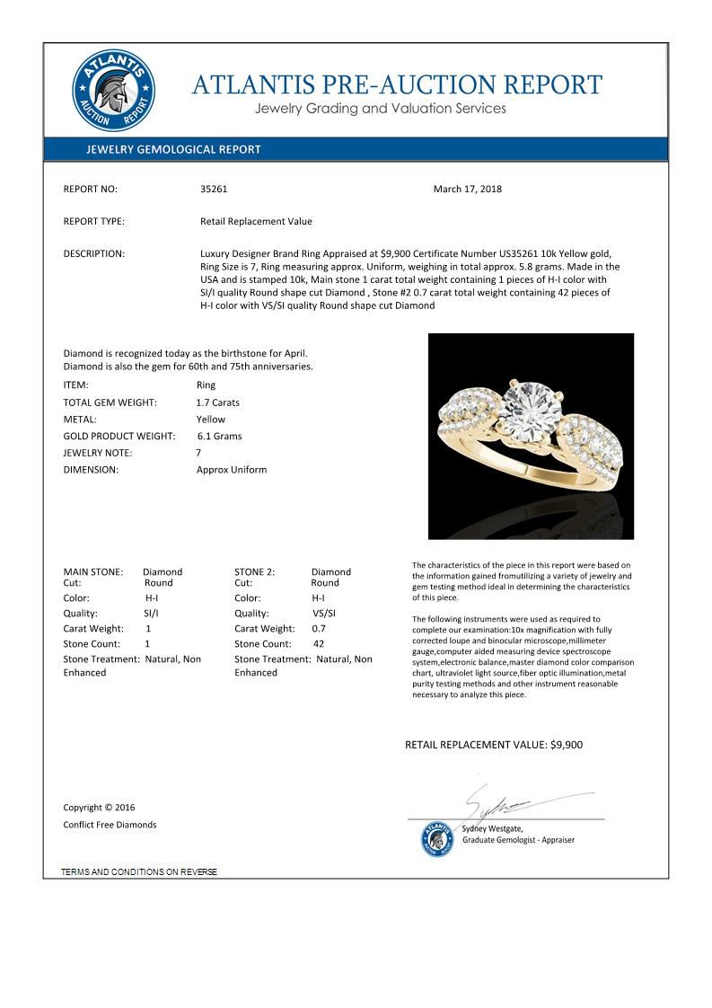 REF-180M2H -35261 ---- 1.7 CTW H-SI/I Certified Diamond Solitaire Ring 10K Yellow Gold ---- Luxury Designer Brand Ring Appraised at $9,900 Certificate Number US35261 10k Yellow gold, Ring Size is 7, Ring measuring approx. Uniform, weighing in total approx. 5.8 grams. Made in the USA and is stamped 10k, Main stone 1 carat total weight containing 1 pieces of H-I color with SI/I quality Round shape cut Diamond , Stone #2 0.7 carat total weight containing 42 pieces of H-I color with VS/SI quality Round shape cut Diamond