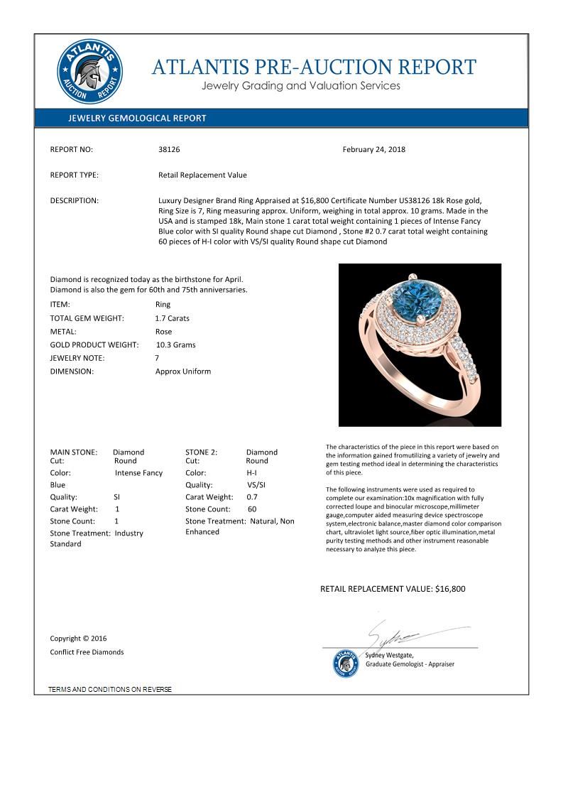 REF-254T5M -38126 ---- 1.7 CTW Intense Blue Diamond Solitaire Engagement Art Deco Ring 18K Rose Gold ---- Luxury Designer Brand Ring Appraised at $16,800 Certificate Number US38126 18k Rose gold, Ring Size is 7, Ring measuring approx. Uniform, weighing in total approx. 10 grams. Made in the USA and is stamped 18k, Main stone 1 carat total weight containing 1 pieces of Intense Fancy Blue color with SI quality Round shape cut Diamond , Stone #2 0.7 carat total weight containing 60 pieces of H-I color with VS/SI quality Round shape cut Diamond
