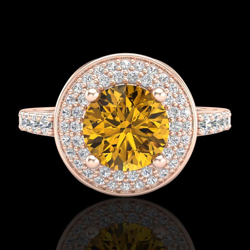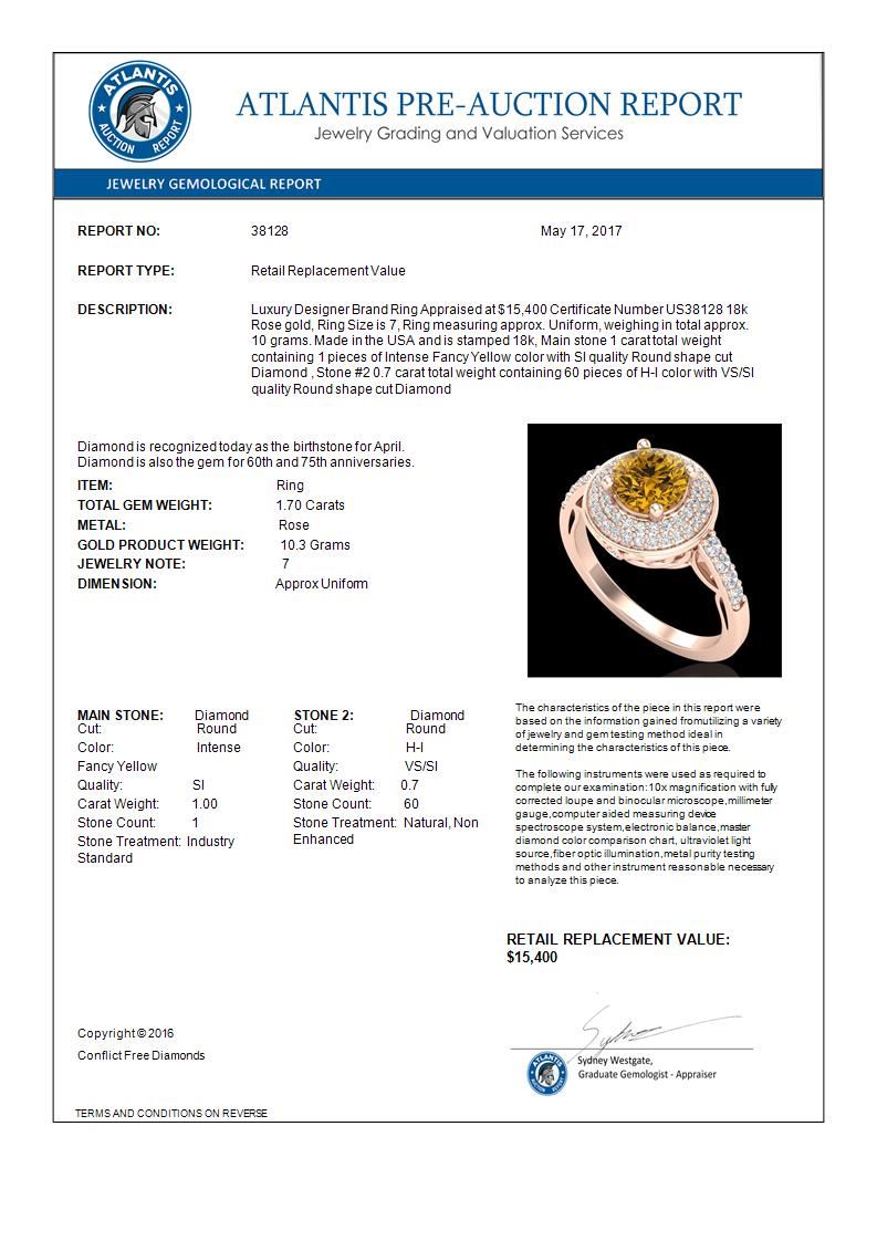 1.7 CTW Intense Fancy Yellow Diamond Engagement Art Deco Ring 18K Rose Gold ---- Luxury Designer Brand Ring Appraised Retail Price at $15,400 ---- SKU Number US38128 18k Rose gold Ring Size is 7, Ring measuring approx. Uniform, weighing in total approx. 10 grams. Made in the USA and is stamped 18k, Main stone 1.00 carat total weight containing 1 pieces of Intense Fancy Yellow color with SI quality Round shape cut Diamond , Stone #2 0.7 carat total weight containing 60 pieces of H-I color with VS/SI quality Round shape cut