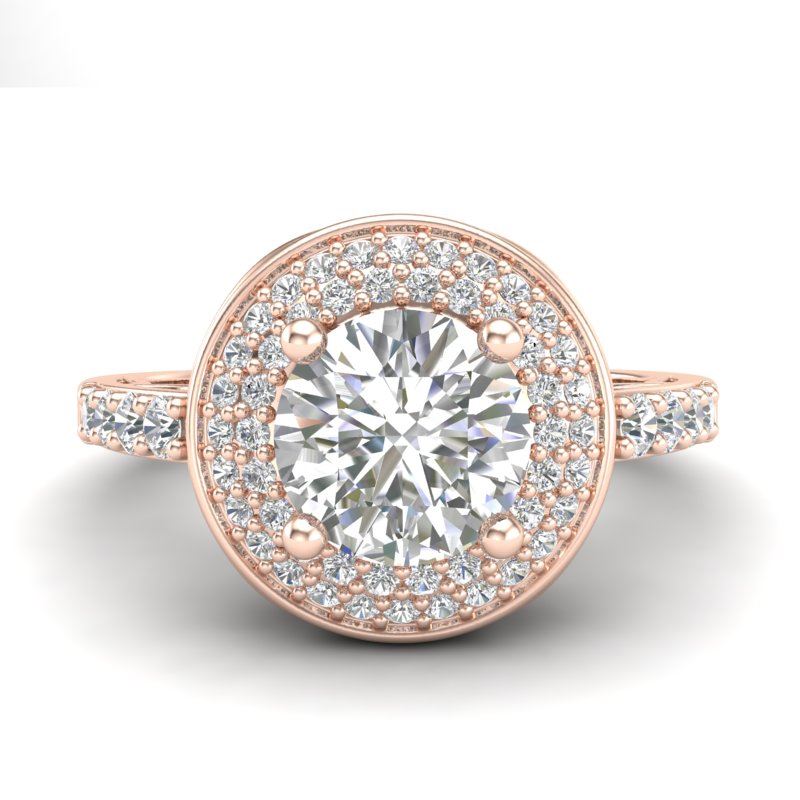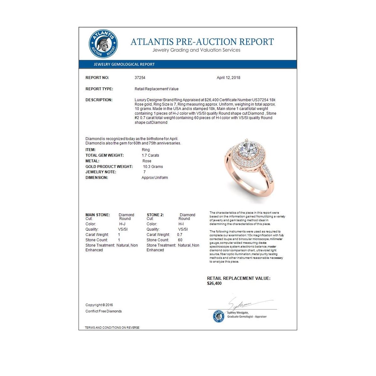 REF-436H4A -37254 ---- 1.7 CTW VS/SI Diamond Solitaire Art Deco Ring 18K Rose Gold ---- Luxury Designer Brand Ring Appraised at $26,400 Certificate Number US37254  18k Rose gold,  Ring Size is 7, Ring measuring approx. Uniform, weighing in total approx. 10 grams. Made in the USA and is stamped 18k, Main stone 1 carat total weight containing 1 pieces of H-J color with VS/SI quality Round shape cut Diamond , Stone #2 0.7 carat total weight containing 60 pieces of H-I color with  VS/SI quality Round shape cut Diamond