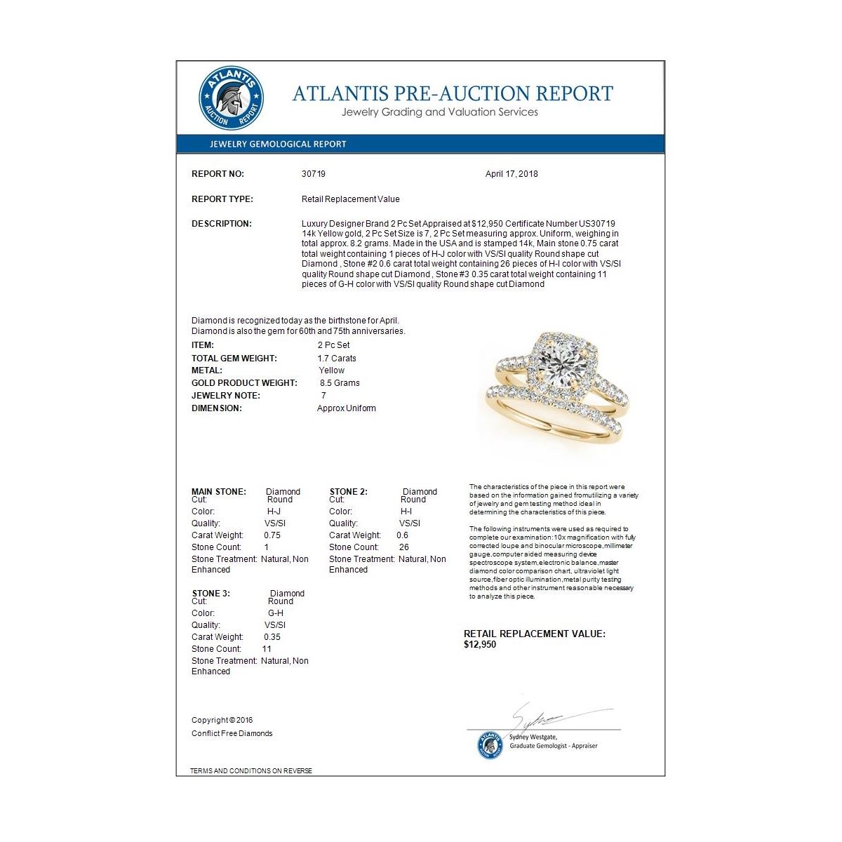 REF-235W3F -30719 ---- 1.70 CTW Certified VS/SI Diamond 2Pc Wedding Set Solitaire Halo 14K Yellow Gold ---- Luxury Designer Brand 2 Pc Set Appraised at $12,950 Certificate Number US30719 14k Yellow gold, 2 Pc Set Size is 7, 2 Pc Set measuring approx. Uniform, weighing in total approx. 8.2 grams. Made in the USA and is stamped 14k, Main stone 0.75 carat total weight containing 1 pieces of H-J color with VS/SI quality Round shape cut Diamond , Stone #2 0.6 carat total weight containing 26 pieces of H-I color with VS/SI quality Round shape cut Diamond , Stone #3 0.35 carat total weight containing 11 pieces of G-H color with VS/SI quality Round shape cut Diamond