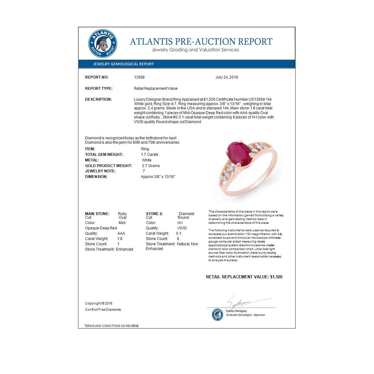 REF-22Y9K -13958 ---- 1.70 CTW Ruby & Diamond Ring 14K White Gold ---- Luxury Designer Brand Ring Appraised at $1,500 Certificate Number US13958 14k White gold, Ring Size is 7, Ring measuring approx. 3/8" x 13/16" , weighing in total approx. 2.4 grams. Made in the USA and is stamped 14k, Main stone 1.6 carat total weight containing 1 pieces of Mid-Opaque-Deep Red color with AAA quality Oval shape cut Ruby , Stone #2 0.1 carat total weight containing 6 pieces of H-I color with VS/SI quality Round shape cut Diamond