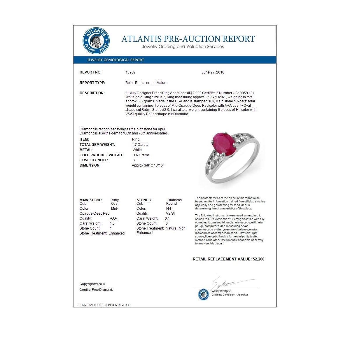 REF-33N5Y -13959 ---- 1.70 CTW Ruby & Diamond Ring 18K White Gold ---- Luxury Designer Brand Ring Appraised at $2,200 Certificate Number US13959 18k White gold, Ring Size is 7, Ring measuring approx. 3/8" x 13/16" , weighing in total approx. 3.3 grams. Made in the USA and is stamped 18k, Main stone 1.6 carat total weight containing 1 pieces of Mid-Opaque-Deep Red color with AAA quality Oval shape cut Ruby , Stone #2 0.1 carat total weight containing 6 pieces of H-I color with VS/SI quality Round shape cut Diamond