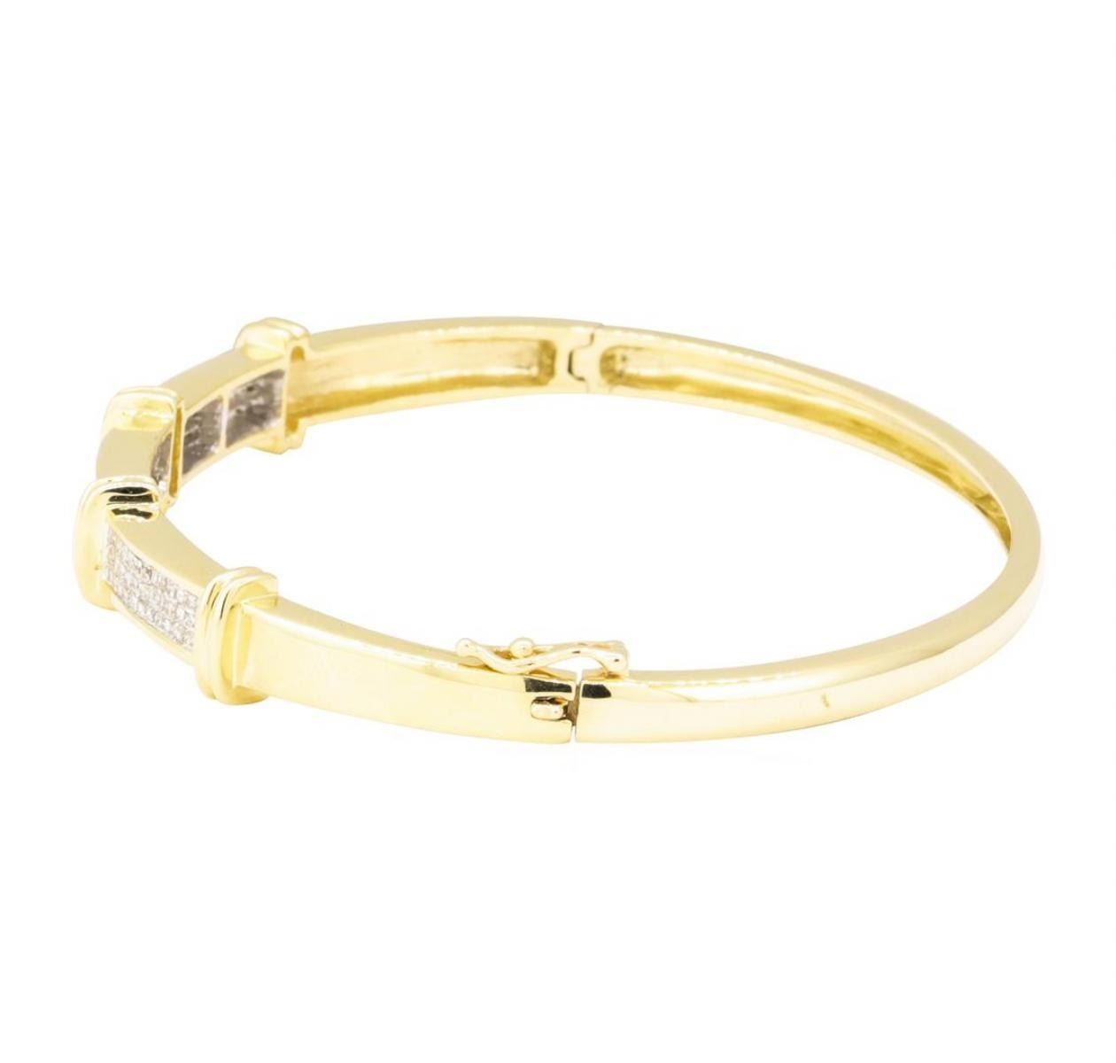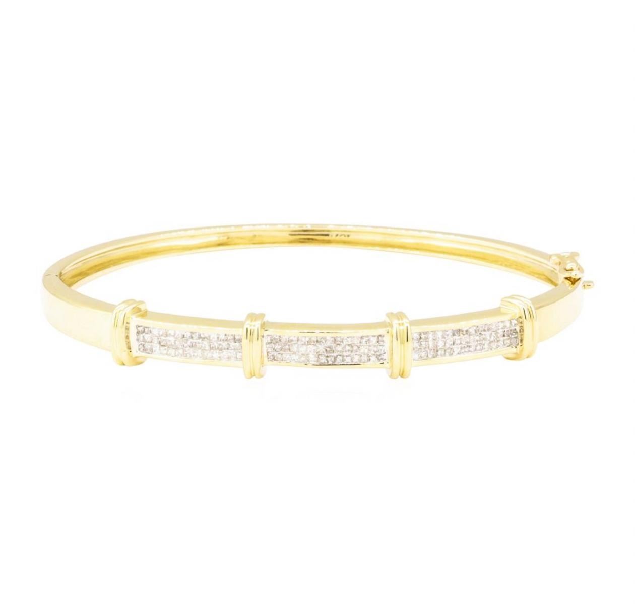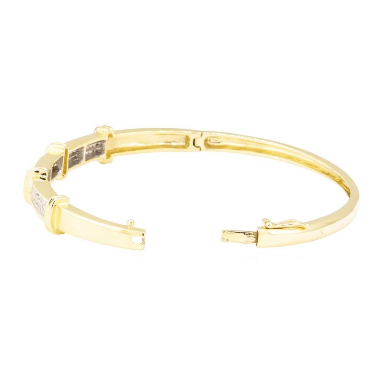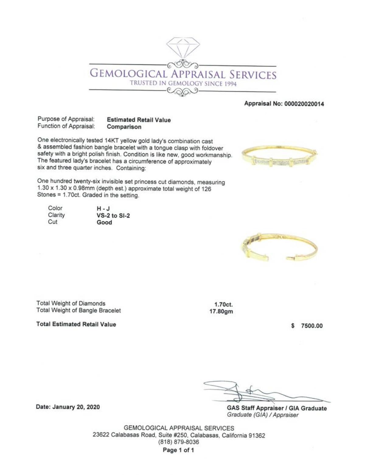 One electronically tested 14KT yellow gold lady's combination cast & assembled fashion bangle bracelet with a tongue clasp with foldover safety with a bright polish finish. The featured lady's bracelet has a circumference of approximately six and three quarter inches. Condition is like new, good workmanship. Containing: One Hundred Twenty-Six invisible set princess cut diamonds, measuring 1.30 x 1.30 x 0.98mm (depth est.) approximate total weight of 126 Stones = 1.70ct. Graded in the setting. Color H - J Clarity VS-2 to SI-2 Cut Good. Total Weight of Diamonds 1.70ct.. Total Weight of Bangle Bracelet 17.80gm GAS Appraised at $7500.00. GAS Appraised.