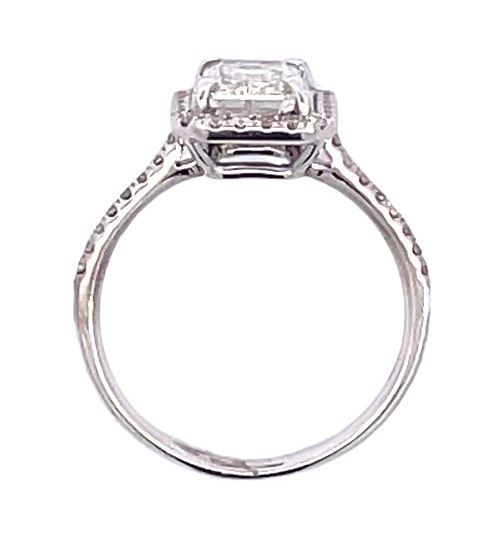 One electronically tested 14KT white gold lady's cast fashion emerald shaped halo wedding ring with a cathedral shank with a bright polish finish. The featured lady's ring has a shank measuring 1.70 millimeters wide. Identified with markings of "14K". Condition is new, good workmanship. Containing: One prong set radiant shaped cut diamond, measuring 8.80 x 5.48 x 3.30mm (depth est.) , 10.00% GTCF approximate weight of 1.50ct. Graded in the setting. Color H - I Clarity SI-1 Cut Very Good Forty prong set round brilliant cut diamonds, measuring 1.10 - 1.05 x 0.67mm (depth est.) approximate total weight of 40 Stones = 0.20ct. Graded in the setting. Color G - H Clarity VS-1 to SI-1 Cut Very Good Total Weight of Diamonds 1.70ct. Total Weight of Wedding Ring 2.80gm