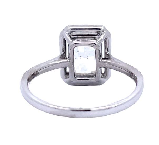 One electronically tested 14KT white gold lady's cast fashion emerald shaped halo wedding ring with a cathedral shank with a bright polish finish. The featured lady's ring has a shank measuring 1.70 millimeters wide. Identified with markings of "14K". Condition is new, good workmanship. Containing: One prong set radiant shaped cut diamond, measuring 8.80 x 5.48 x 3.30mm (depth est.), 10.00% GTCF approximate weight of 1.50ct. Graded in the setting. Color H - I Clarity SI-1 Cut Very Good Forty prong set round brilliant cut diamonds, measuring 1.10 - 1.05 x 0.67mm (depth est.) approximate total weight of 40 Stones = 0.20ct. Graded in the setting. Color G - H Clarity VS-1 to SI-1 Cut Very Good Total Weight of Diamonds 1.70ct. Total Weight of Wedding Ring 2.80gm