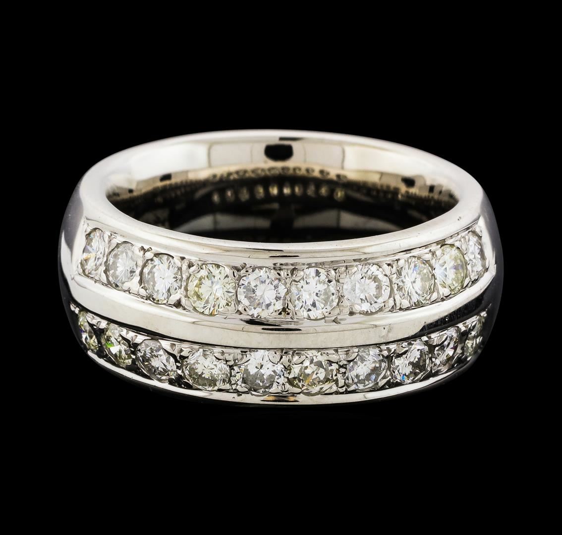 One electronically tested 14KT white gold man's cast two row wedding band with a bright polish finish. The featured man's ring has a shank measuring 9.48 millimeters wide. Identified with markings of '14K'. Condition is new, good workmanship. Containing: Twenty bead set round brilliant cut diamonds, measuring 2.90 - 2.70 x 1.74mm (depth est.) approximate total weight of 20 Stones = 1.70ct. Graded in the setting. Clarity SI-1 to I-1. Color: H - J Cut Good. Total Weight of Diamonds 1.70ct.. Total Weight of Band 21.60gm. GAS Appraised at $6,010.00.
