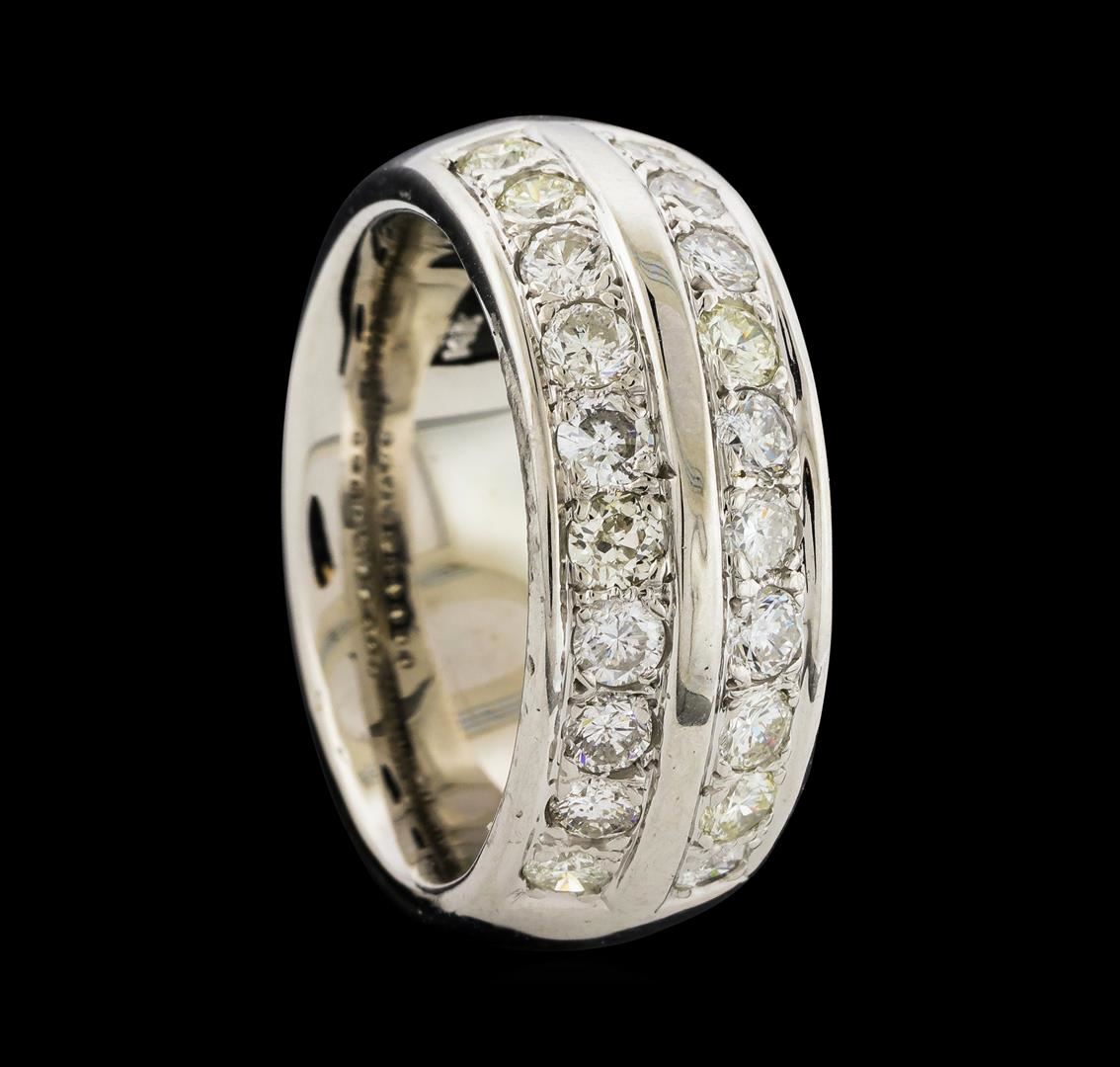 One electronically tested 14KT white gold man's cast two row wedding band with a bright polish finish. The featured man's ring has a shank measuring 9.48 millimeters wide. Identified with markings of '14K'. Condition is new, good workmanship. Containing: Twenty bead set round brilliant cut diamonds, measuring 2.90 - 2.70 x 1.74mm (depth est.) approximate total weight of 20 Stones = 1.70ct. Graded in the setting. Clarity SI-1 to I-1. Color: H - J Cut Good. Total Weight of Diamonds 1.70ct.. Total Weight of Band 21.60gm. GAS Appraised at $6,010.00.