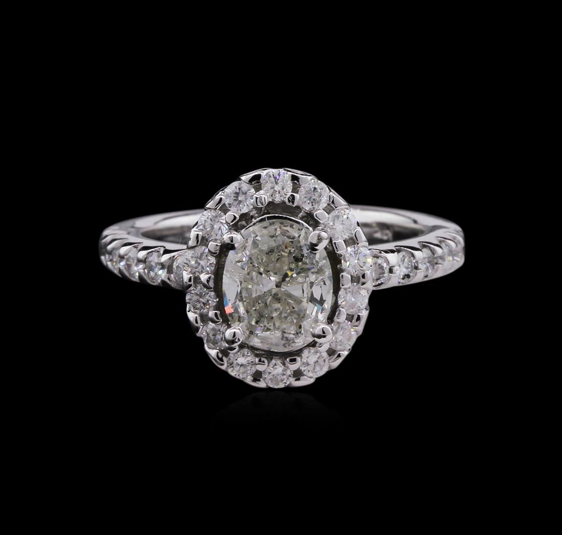 One electronically tested 14KT white gold lady's cast wedding ring with a halo with a bright polish finish. The featured lady's ring has a shank measuring 2.55 millimeters wide. Identified with markings of "14K". Condition is new, good workmanship. Containing: One prong set oval shaped cut diamond, measuring 7.40 x 6.32 x 3.60mm (depth est.) approximate weight of 1.05ct. Graded in the setting. Clarity: I-1. Color: I. Cut Good Twenty-Six prong set round brilliant cut diamonds, measuring 1.90 - 1.80 x 1.18mm (depth est.) approximate total weight of 26 Stones = 0.65ct. Graded in the setting. Clarity: SI-1 to I-1. Color: H - I. Cut Good. Total Weight of Diamonds 1.70ct. Total Weight of Ring 6.10gm. GAS Appraised.
