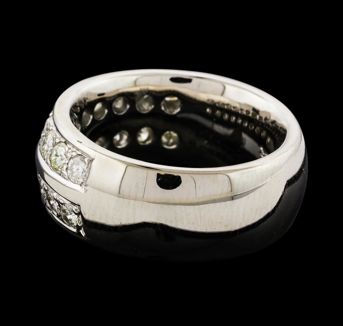One electronically tested 14KT white gold man's cast two row wedding band with a bright polish finish. The featured man's ring has a shank measuring 9.48 millimeters wide. Identified with markings of '14K'. Condition is new, good workmanship. Containing: Twenty bead set round brilliant cut diamonds, measuring 2.90 - 2.70 x 1.74mm (depth est.) approximate total weight of 20 Stones = 1.70ct. Graded in the setting. Clarity SI-1 to I-1. Color: H - J Cut Good. Total Weight of Diamonds 1.70ct.. Total Weight of Band 21.60gm. GAS Appraised at $6,010.00.