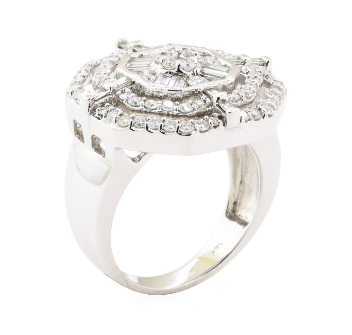 One electronically tested 14KT white gold lady's combination cast & assembled fashion ring with a octagonal double halo with a bright polish finish. The featured lady's ring has a shank measuring 3.15 millimeters wide. Identified with markings of '14K'. Condition is new, good workmanship. Containing: Eight channel set baguette cut diamonds, measuring from 2.70 x 1.30 x 1.11mm (depth est.) to 2.80 x 1.40 x 1.19mm (depth est.) approximate total weight of 8 Stones = 0.32ct. Graded in the setting. Color G - H Clarity VS-1 to VS-2 Cut Very Good Eight channel set baguette cut diamonds, measuring from 1.70 x 1.15 x 0.98mm (depth est.) to 1.90 x 1.20 x 1.02mm (depth est.) approximate total weight of 8 Stones = 0.13ct. Graded in the setting. Color G - H Clarity VS-1 to VS-2 Cut Very Good Five channel set round brilliant cut diamonds, measuring 2.30 - 2.20 x 1.40mm (depth est.) approximate total weight of 5 Stones = 0.22ct. Graded in the setting. Color G - H Clarity VS-2 to SI-1 Cut Very Good Sixty-Six prong set round brilliant cut diamonds, measuring 1.65 - 1.55 x 0.99mm (depth est.) approximate total weight of 66 Stones = 1.03ct. Graded in the setting. Color G - H Clarity SI-1 to SI-2 Cut Very Good. Total Weight of Diamonds 1.70ct.. Total Weight of Ring 9.60gm GAS Appraised at $6685.00. GAS Appraised at $6,685.00.