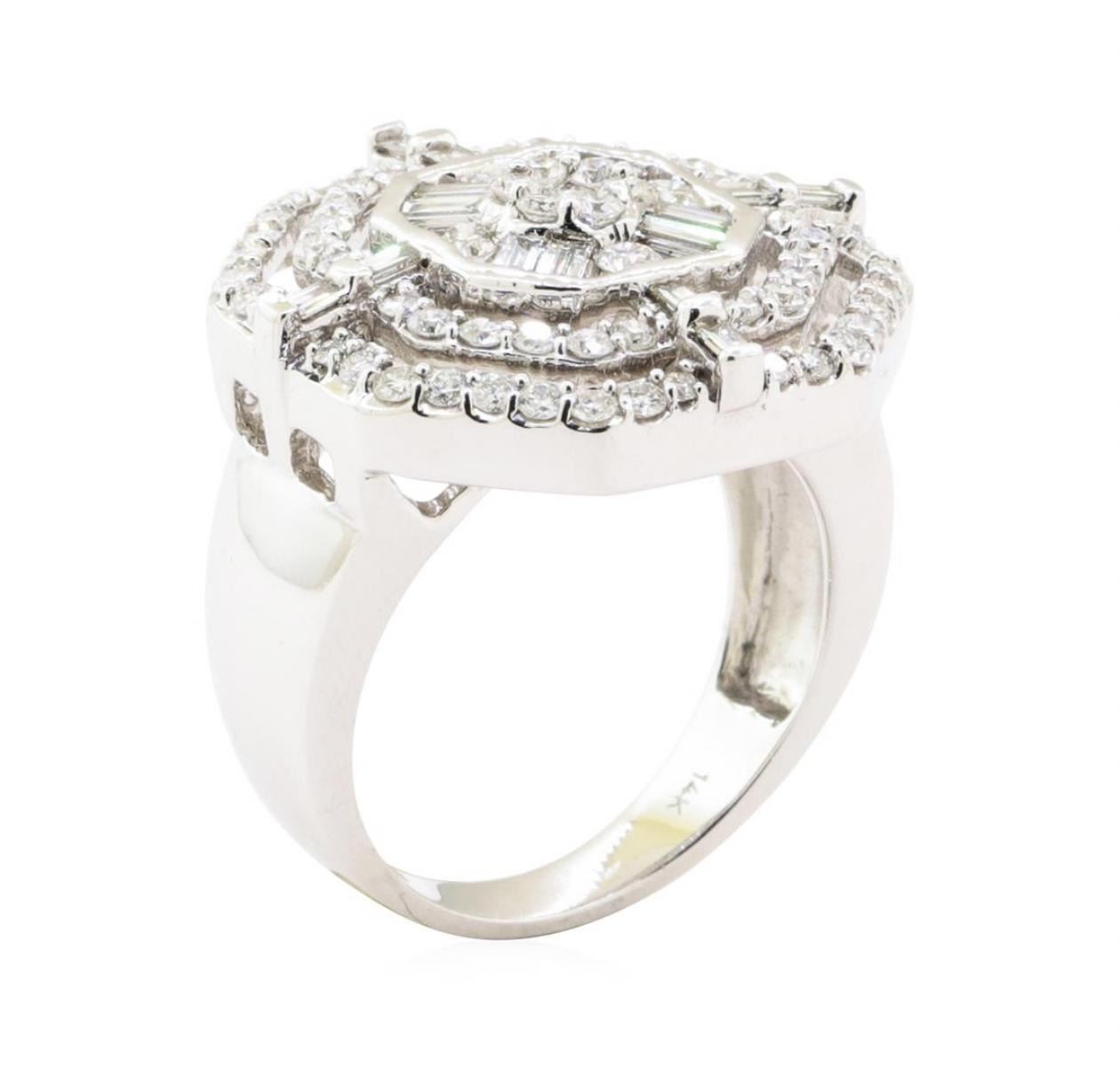 One electronically tested 14KT white gold lady's combination cast & assembled fashion ring with a octagonal double halo with a bright polish finish. The featured lady's ring has a shank measuring 3.15 millimeters wide. Identified with markings of '14K'. Condition is new, good workmanship. Containing: Eight channel set baguette cut diamonds, measuring from 2.70 x 1.30 x 1.11mm (depth est.) to 2.80 x 1.40 x 1.19mm (depth est.) approximate total weight of 8 Stones = 0.32ct. Graded in the setting. Color G - H Clarity VS-1 to VS-2 Cut Very Good Eight channel set baguette cut diamonds, measuring from 1.70 x 1.15 x 0.98mm (depth est.) to 1.90 x 1.20 x 1.02mm (depth est.) approximate total weight of 8 Stones = 0.13ct. Graded in the setting. Color G - H Clarity VS-1 to VS-2 Cut Very Good Five channel set round brilliant cut diamonds, measuring 2.30 - 2.20 x 1.40mm (depth est.) approximate total weight of 5 Stones = 0.22ct. Graded in the setting. Color G - H Clarity VS-2 to SI-1 Cut Very Good Sixty-Six prong set round brilliant cut diamonds, measuring 1.65 - 1.55 x 0.99mm (depth est.) approximate total weight of 66 Stones = 1.03ct. Graded in the setting. Color G - H Clarity SI-1 to SI-2 Cut Very Good. Total Weight of Diamonds 1.70ct.. Total Weight of Ring 9.60gm GAS Appraised at $6685.00. GAS Appraised.