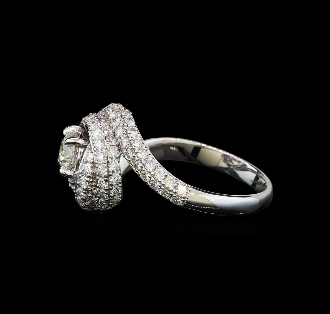 One electronically tested 14KT white gold lady's cast wedding ring with a bypass swirl halo with a bright polish finish. The featured lady's ring has a shank measuring 2.51 millimeters wide. Identified with markings of 'K14'. Condition is new, good workmanship. Containing: One prong set round brilliant cut diamond, measuring 5.00 - 4.93 x 3.48mm (depth est.) approximate weight of 0.55ct. Graded in the setting. Clarity I-1. Color: J Cut Good Ninety prong set round brilliant cut diamonds, measuring 1.50 - 1.40 x 0.90mm (depth est.) approximate total weight of 90 Stones = 1.05ct. Graded in the setting. Clarity SI-1 to I-1. Color: H - I Cut Good Twelve prong set round brilliant cut diamonds, measuring 1.35 - 1.25 x 0.81mm (depth est.) approximate total weight of 12 Stones = 0.10ct. Graded in the setting. Clarity SI-1 to I-1. Color: H - I Cut Good. Total Weight of Diamonds 1.70ct.. Total Weight of Ring 4.80gm. GAS Appraised.