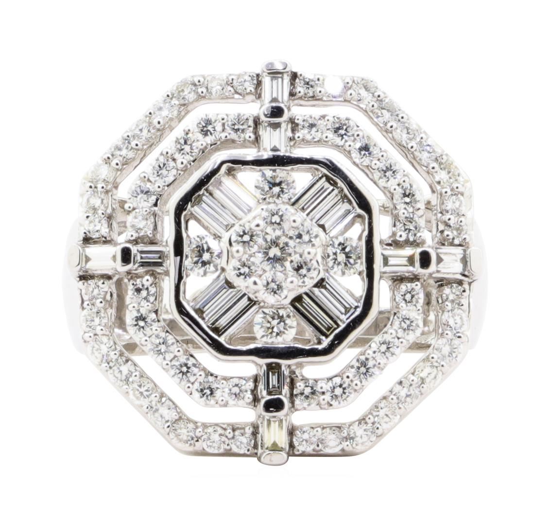 One electronically tested 14KT white gold lady's combination cast & assembled fashion ring with a octagonal double halo with a bright polish finish. The featured lady's ring has a shank measuring 3.15 millimeters wide. Identified with markings of '14K'. Condition is new, good workmanship. Containing: Eight channel set baguette cut diamonds, measuring from 2.70 x 1.30 x 1.11mm (depth est.) to 2.80 x 1.40 x 1.19mm (depth est.) approximate total weight of 8 Stones = 0.32ct. Graded in the setting. Color G - H Clarity VS-1 to VS-2 Cut Very Good Eight channel set baguette cut diamonds, measuring from 1.70 x 1.15 x 0.98mm (depth est.) to 1.90 x 1.20 x 1.02mm (depth est.) approximate total weight of 8 Stones = 0.13ct. Graded in the setting. Color G - H Clarity VS-1 to VS-2 Cut Very Good Five channel set round brilliant cut diamonds, measuring 2.30 - 2.20 x 1.40mm (depth est.) approximate total weight of 5 Stones = 0.22ct. Graded in the setting. Color G - H Clarity VS-2 to SI-1 Cut Very Good Sixty-Six prong set round brilliant cut diamonds, measuring 1.65 - 1.55 x 0.99mm (depth est.) approximate total weight of 66 Stones = 1.03ct. Graded in the setting. Color G - H Clarity SI-1 to SI-2 Cut Very Good. Total Weight of Diamonds 1.70ct.. Total Weight of Ring 9.60gm GAS Appraised at $6685.00. GAS Appraised.