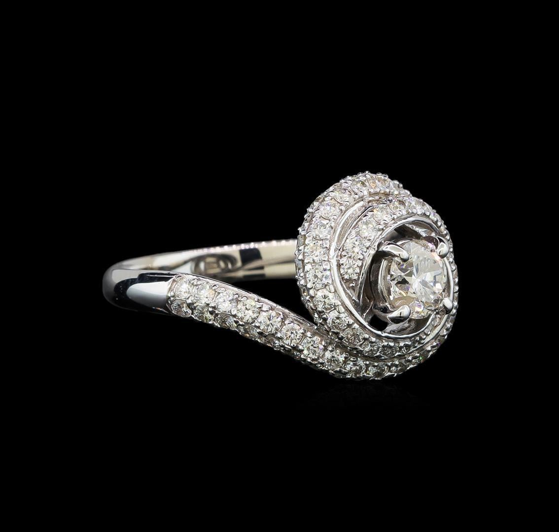 One electronically tested 14KT white gold lady's cast wedding ring with a bypass swirl halo with a bright polish finish. The featured lady's ring has a shank measuring 2.51 millimeters wide. Identified with markings of 'K14'. Condition is new, good workmanship. Containing: One prong set round brilliant cut diamond, measuring 5.00 - 4.93 x 3.48mm (depth est.) approximate weight of 0.55ct. Graded in the setting. Clarity I-1. Color: J Cut Good Ninety prong set round brilliant cut diamonds, measuring 1.50 - 1.40 x 0.90mm (depth est.) approximate total weight of 90 Stones = 1.05ct. Graded in the setting. Clarity SI-1 to I-1. Color: H - I Cut Good Twelve prong set round brilliant cut diamonds, measuring 1.35 - 1.25 x 0.81mm (depth est.) approximate total weight of 12 Stones = 0.10ct. Graded in the setting. Clarity SI-1 to I-1. Color: H - I Cut Good. Total Weight of Diamonds 1.70ct.. Total Weight of Ring 4.80gm. GAS Appraised.