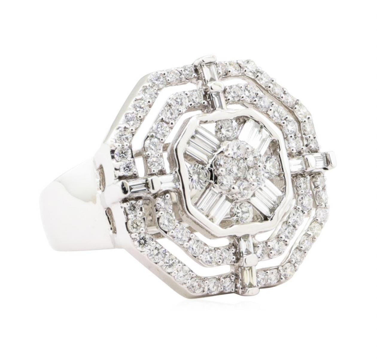 One electronically tested 14KT white gold lady's combination cast & assembled fashion ring with a octagonal double halo with a bright polish finish. The featured lady's ring has a shank measuring 3.15 millimeters wide. Identified with markings of '14K'. Condition is new, good workmanship. Containing: Eight channel set baguette cut diamonds, measuring from 2.70 x 1.30 x 1.11mm (depth est.) to 2.80 x 1.40 x 1.19mm (depth est.) approximate total weight of 8 Stones = 0.32ct. Graded in the setting. Color G - H Clarity VS-1 to VS-2 Cut Very Good Eight channel set baguette cut diamonds, measuring from 1.70 x 1.15 x 0.98mm (depth est.) to 1.90 x 1.20 x 1.02mm (depth est.) approximate total weight of 8 Stones = 0.13ct. Graded in the setting. Color G - H Clarity VS-1 to VS-2 Cut Very Good Five channel set round brilliant cut diamonds, measuring 2.30 - 2.20 x 1.40mm (depth est.) approximate total weight of 5 Stones = 0.22ct. Graded in the setting. Color G - H Clarity VS-2 to SI-1 Cut Very Good Sixty-Six prong set round brilliant cut diamonds, measuring 1.65 - 1.55 x 0.99mm (depth est.) approximate total weight of 66 Stones = 1.03ct. Graded in the setting. Color G - H Clarity SI-1 to SI-2 Cut Very Good. Total Weight of Diamonds 1.70 ct.. Total Weight of Ring 9.60gm GAS Appraised at $6685.00. GAS Appraised.