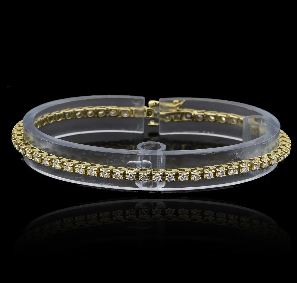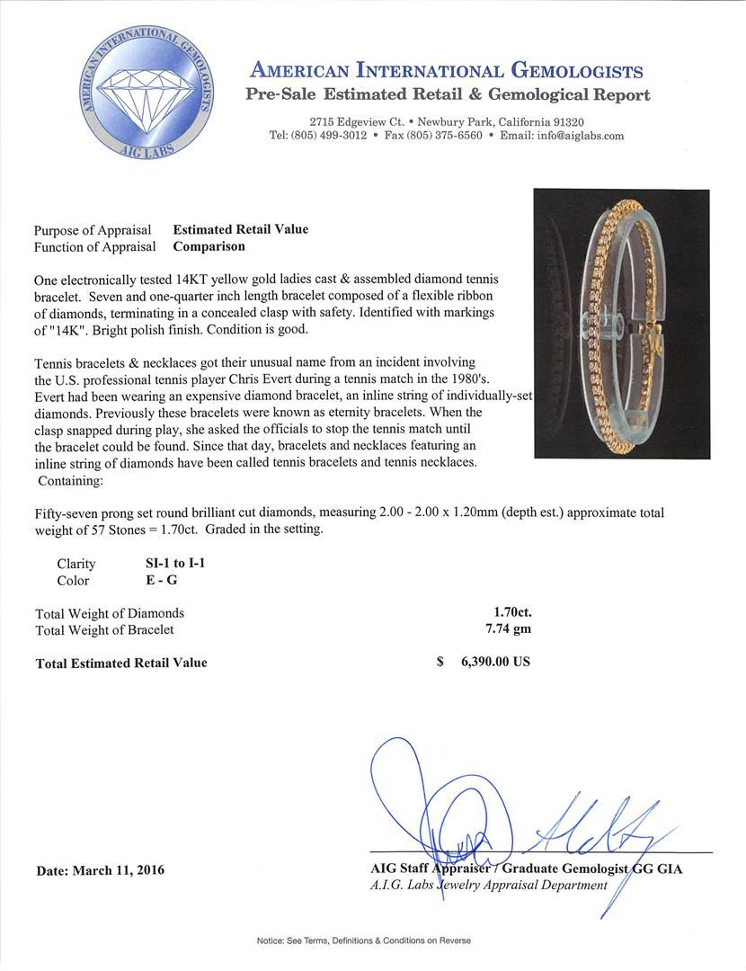 One electronically tested 14KT yellow gold ladies cast & assembled diamond tennis bracelet. Seven and one-quarter inch length bracelet composed of a flexible ribbon of diamonds, terminating in a concealed clasp with safety. Identified with markings of "14K". Bright polish finish. Condition is good. Tennis bracelets & necklaces got their unusual name from an incident involving the U.S. professional tennis player Chris Evert during a tennis match in the 1980's. Evert had been wearing an expensive diamond bracelet, an inline string of individually-set diamonds. Previously these bracelets were known as eternity bracelets. When the clasp snapped during play, she asked the officials to stop the tennis match until the bracelet could be found. Since that day, bracelets and necklaces featuring an inline string of diamonds have been called tennis bracelets and tennis necklaces. Containing: Fifty-Seven prong set round brilliant cut diamonds, measuring 2.00 - 2.00 x 1.20mm (depth est.) approximate total weight of 57 Stones = 1.70ct. Graded in the setting. Clarity: SI-1 to I-1. Color: E - G. Total Weight of Diamonds 1.70ct. Total Weight of Bracelet 7.74gm. AIG Appraised at $6,390.00.