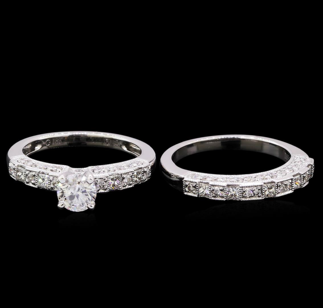 One electronically tested 18KT white gold ladies cast diamond wedding set. The wedding set includes a diamond engagement ring and a matching diamond wedding band. The engagement ring features a diamond supported by stylized diamond set shoulders, completed by a two millimeter wide band. The matching wedding band features a stylized diamond ribbon, completed by a two millimeter wide band. Bright polish finish with milgrain detailing. Identified with markings of "18K". Condition is new, good workmanship. Containing: One prong set round brilliant cut diamond, measuring 5.40 - 5.40 x 3.60mm (depth est.), 5.00.%. GTCF approximate weight of 0.72ct. Graded in the setting. Clarity: I-2. Color: 66.7%. Table 60.2%. Nine channel set princess cut diamonds, measuring 2.00 x 1.90 x 1.43mm (depth est.) approximate total weight of 9 Stones = 0.40ct. Graded in the setting. Clarity: VS-1 to SI-1. Color: F - H Sixty-Two prong set round brilliant cut diamonds, measuring 1.60 - 1.20 x 0.84mm (depth est.) approximate total weight of 62 Stones = 0.58ct. Graded in the setting. Clarity: SI-2 to I-2. Color: F - H. Total Weight of Diamonds 1.70ct. Total Weight of Wedding Set 8.64gm. AIG Appraised at $9,310.00.