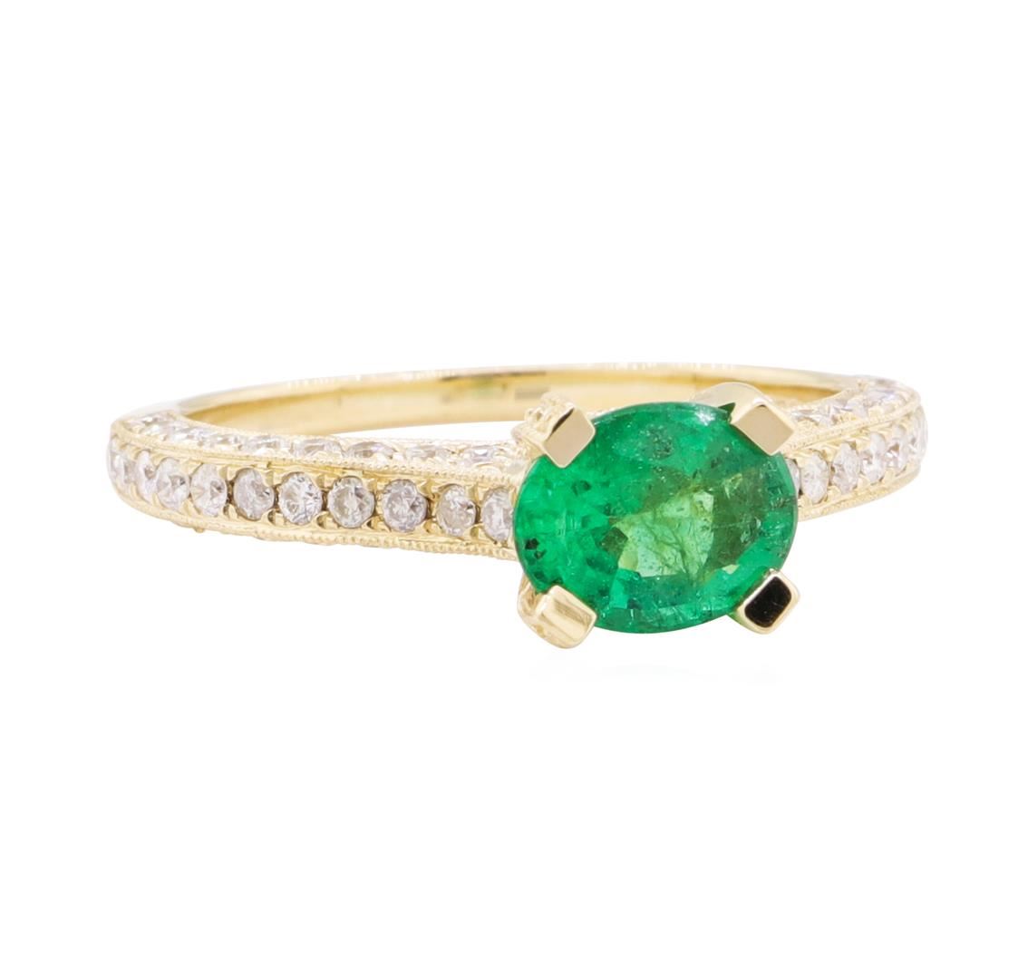 One electronically tested 14KT yellow gold lady's cast fashion ring with a cathedral shank with a bright polish with milgrain detailing finish. The featured lady's ring has a shank measuring 1.50 millimeters wide. Trademark is Orianne. Identified with markings of '14K'. Condition is new, good workmanship. Containing: One prong set oval modified mixed cut natural emerald, measuring 7.61 x 5.98 x 3.92mm, (depth est.) approximate weight of 1.06ct., clarity is heavily included, medium dark, strong, green color, (GIA G 6/5), cut is good. Transmitting light somewhat diffusely, transparent to translucent. Naturally occurring internal & external characteristics are present. Indications of oil residue. Colored gemstones are presumed to have been subjected to commonly used enhancement processes. Graded in the setting. Fifty-Eight prong set round brilliant cut diamonds, measuring 1.50 - 1.40 x 0.87mm (depth est.) approximate total weight of 58 Stones = 0.64ct. Graded in the setting. Color I - J Clarity SI-2 to I-1 Cut Good Ten prong set round brilliant cut diamonds, measuring 1.20 - 1.15 x 0.71mm (depth est.) approximate total weight of 10 Stones = 0.06ct. Graded in the setting. Color H - J Clarity SI-2 to I-1 Cut Good. Total Weight of Colored Stones 1.06ct.. Total Weight of Diamonds 0.70ct.. Total Weight of Ring 3.60gm GAS Appraised at $3165.00. GAS Appraised at $3,165.00.