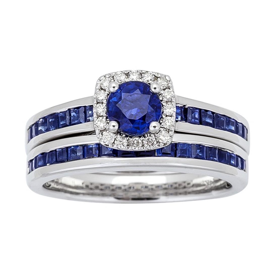 One Ring : 14KT white gold weighing 6.41gm containing one blue sapphire center stone with a total weight of 0.57ct, 32 blue sapphire stones weighing 1.13ctw, and side diamonds weighing 0.10ctw.