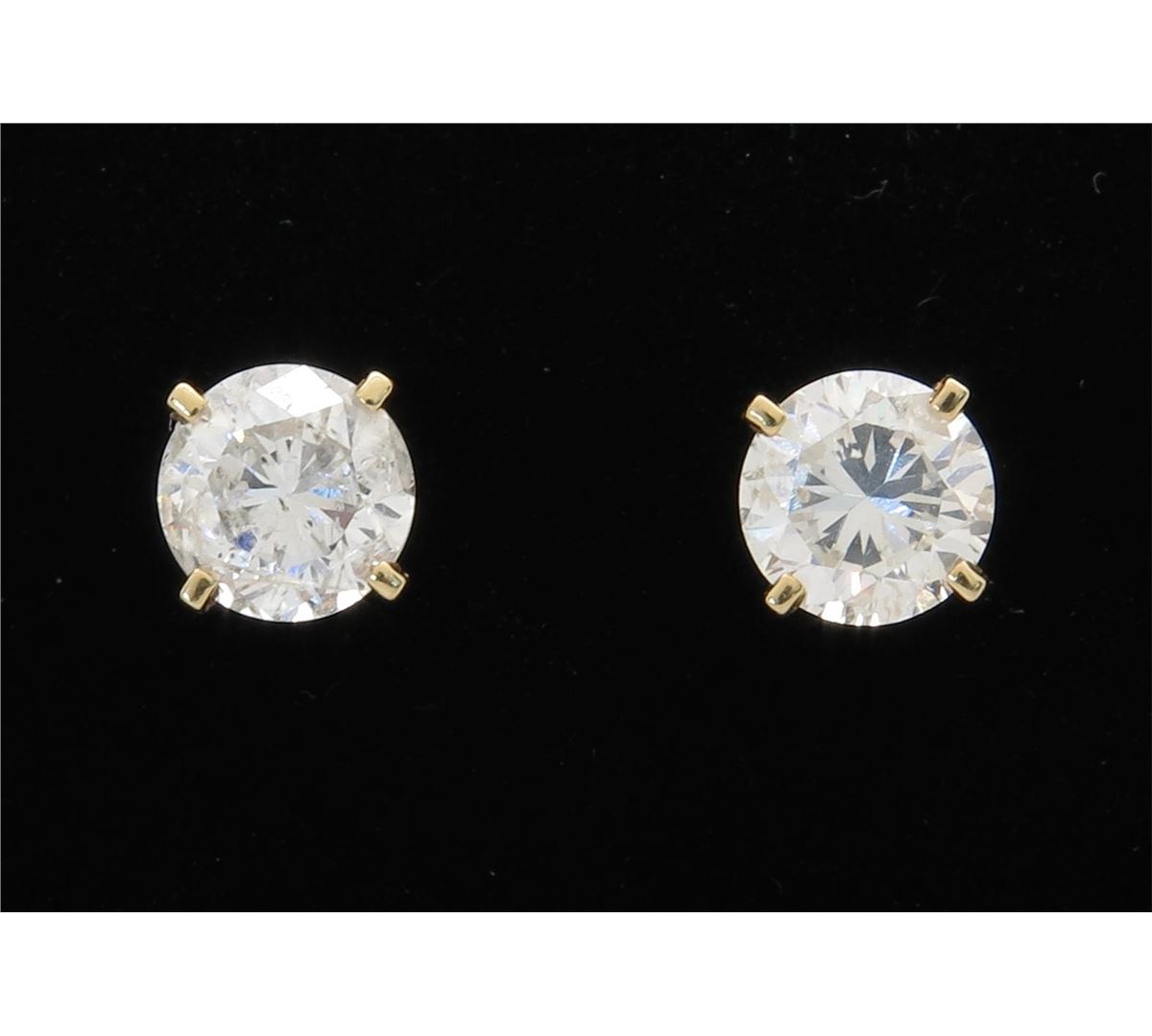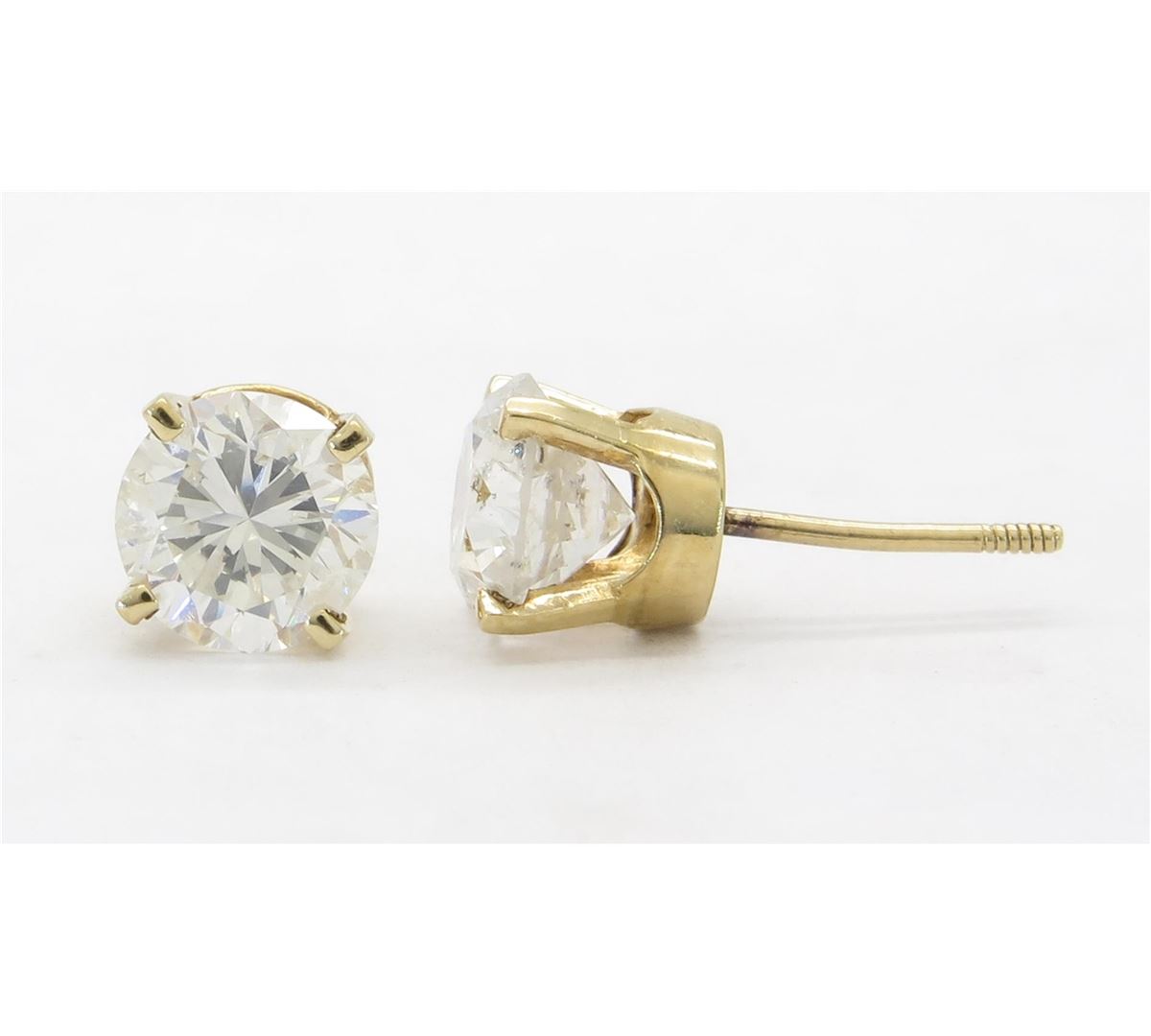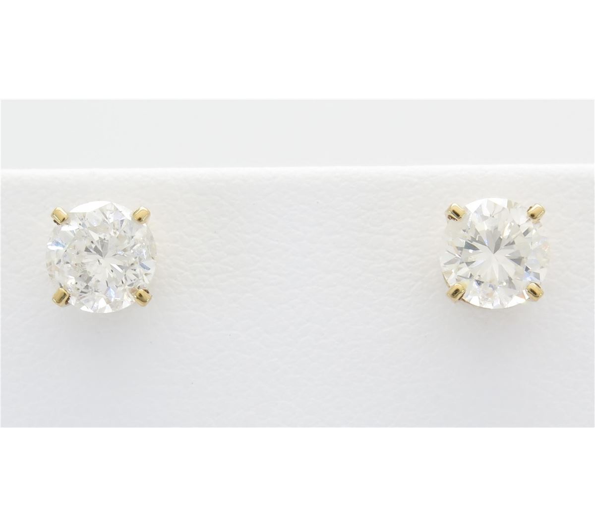 One tested pair of 14k yellow gold diamond earrings. Containing: Two Round Brilliant cut diamonds. Approximate weight: 1.70CTW, Clarity: I, Color: G-H. Diamonds are graded in the mounting, unless otherwise stated. Weight of earrings: 1.6 grams.