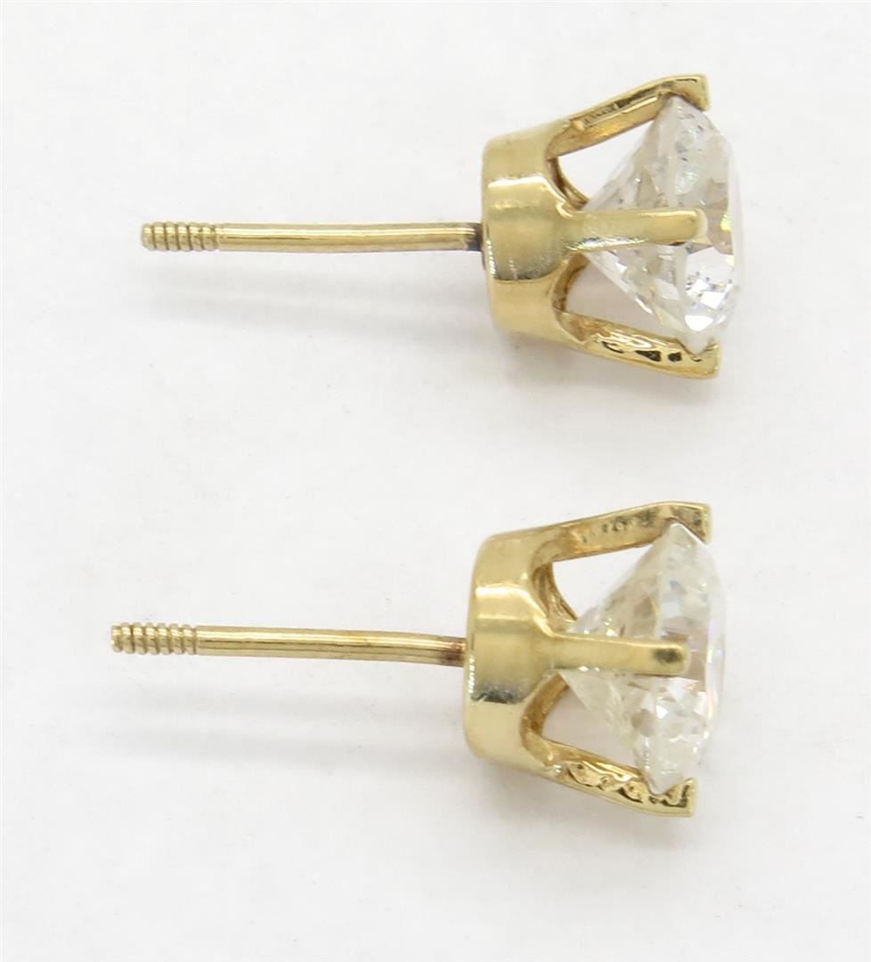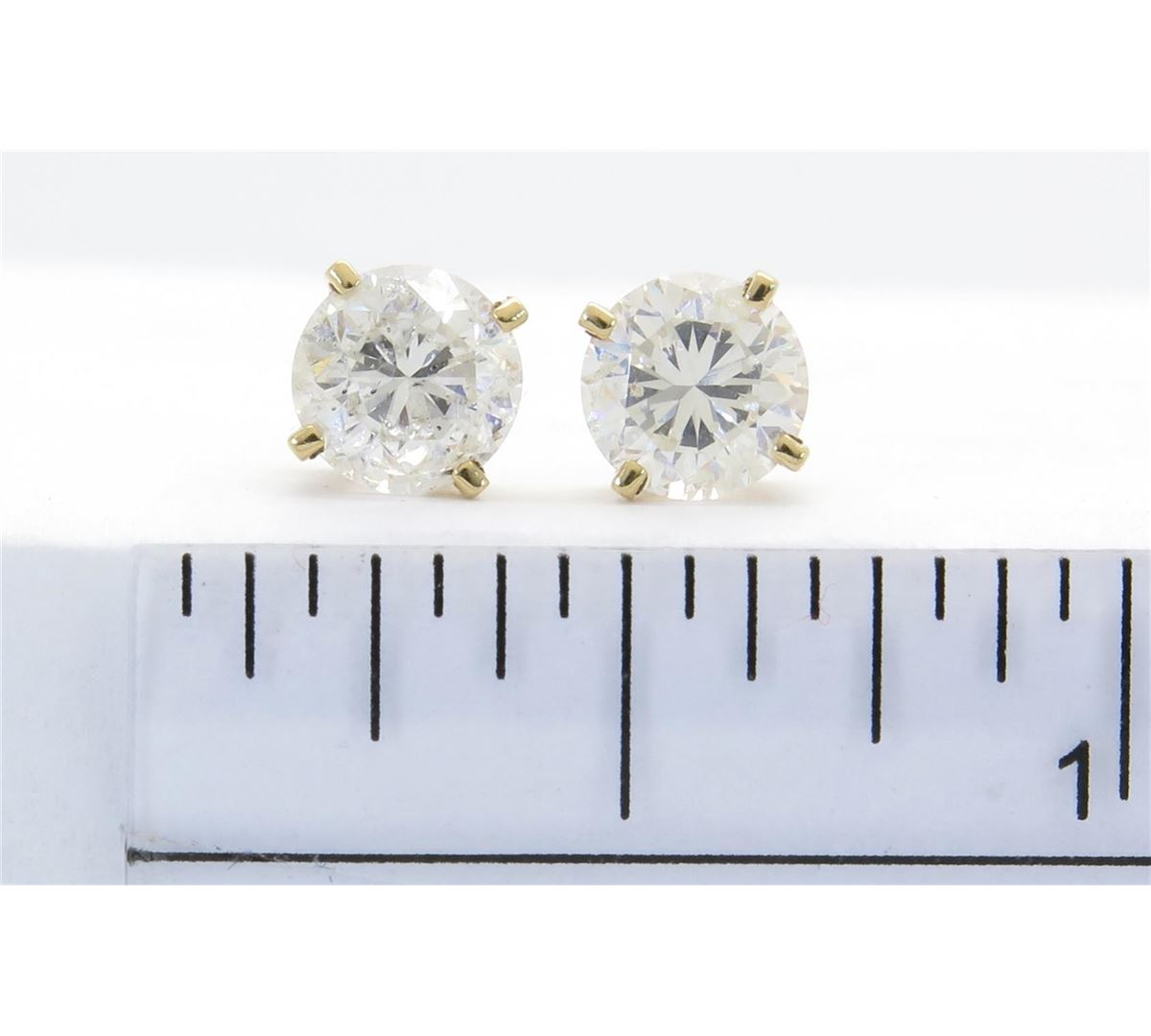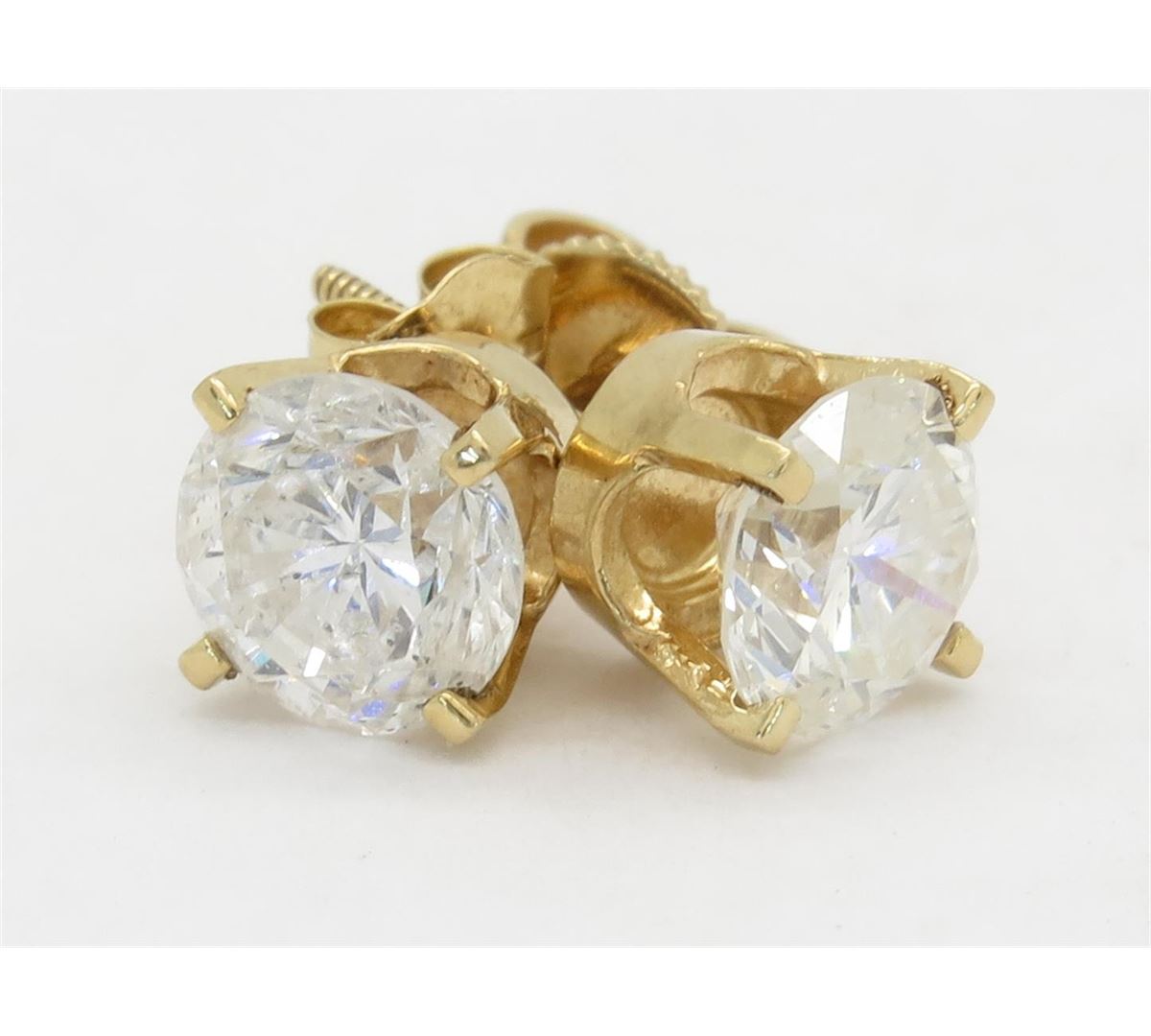 One tested pair of 14k yellow gold diamond earrings. Containing: Two Round Brilliant cut diamonds. Approximate weight: 1.70CTW, Clarity: I, Color: G-H. Diamonds are graded in the mounting, unless otherwise stated. Weight of earrings: 1.6 grams.