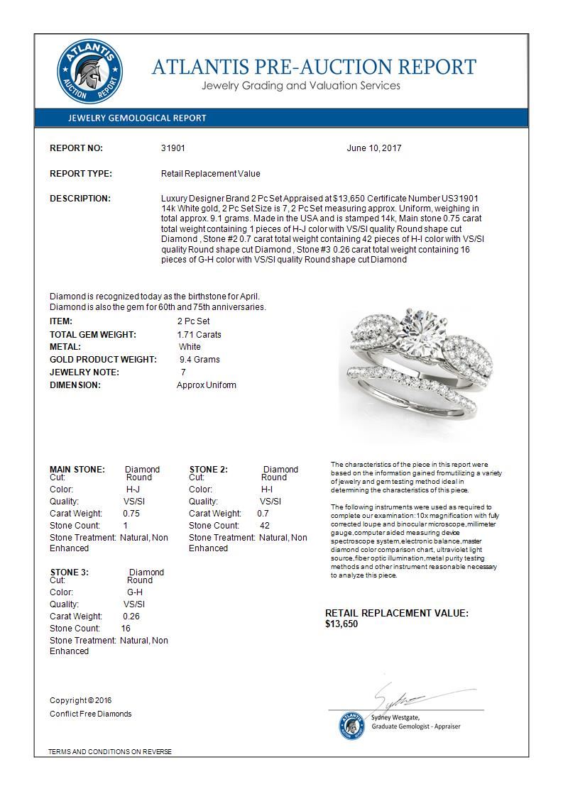 1.71 CTW Certified VS/SI Diamond Solitaire 2Pc Wedding Set 14K White Gold ---- Luxury Designer Brand 2 Pc Set Appraised Retail Price at $13,650 ---- SKU Number US31901 14k White gold 2 Pc Set Size is 7, 2 Pc Set measuring approx. Uniform, weighing in total approx. 9.1 grams. Made in the USA and is stamped 14k, Main stone 0.75 carat total weight containing 1 pieces of H-J color with VS/SI quality Round shape cut Diamond , Stone #2 0.7 carat total weight containing 42 pieces of H-I color with VS/SI quality Round shape cut
