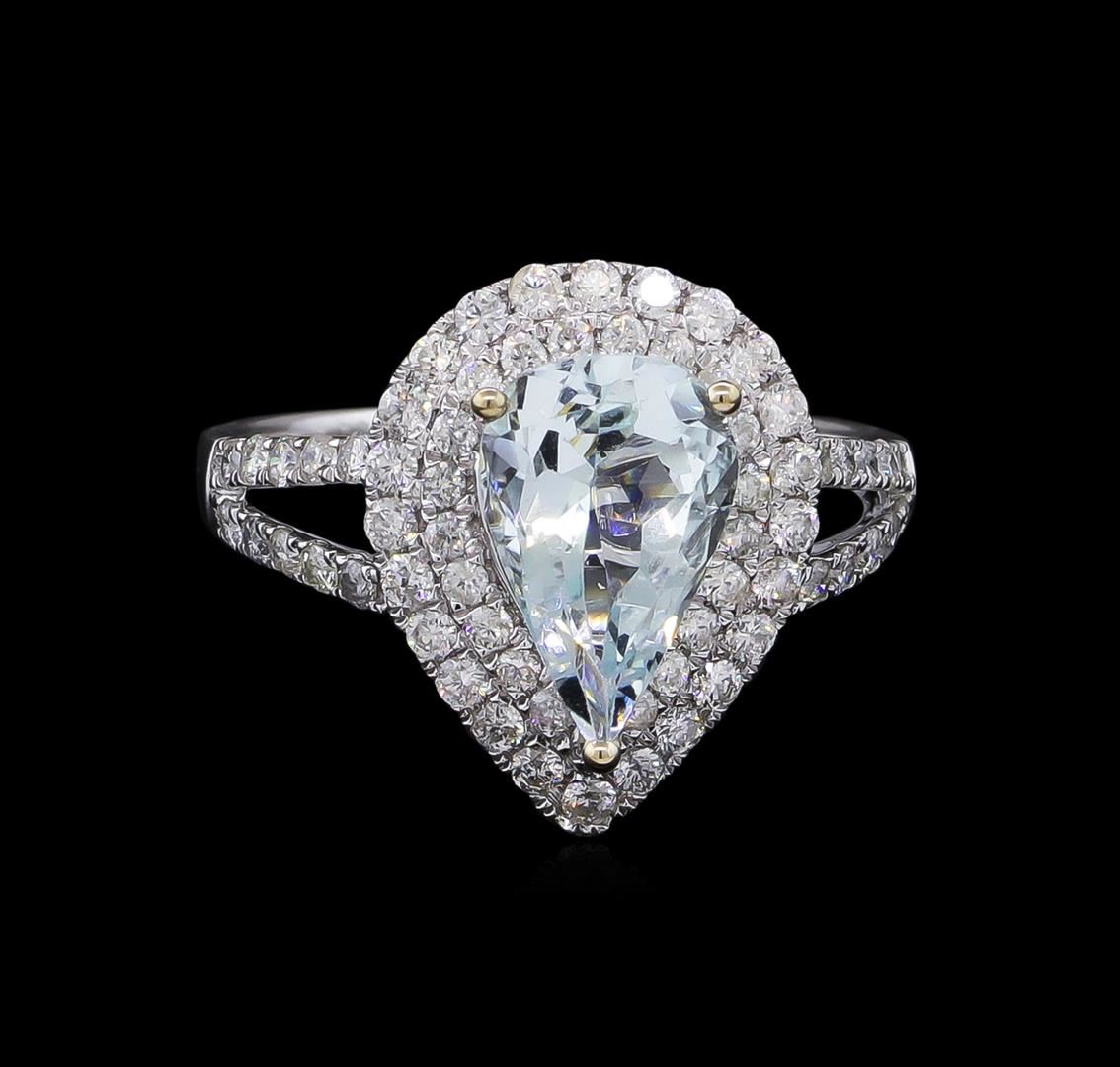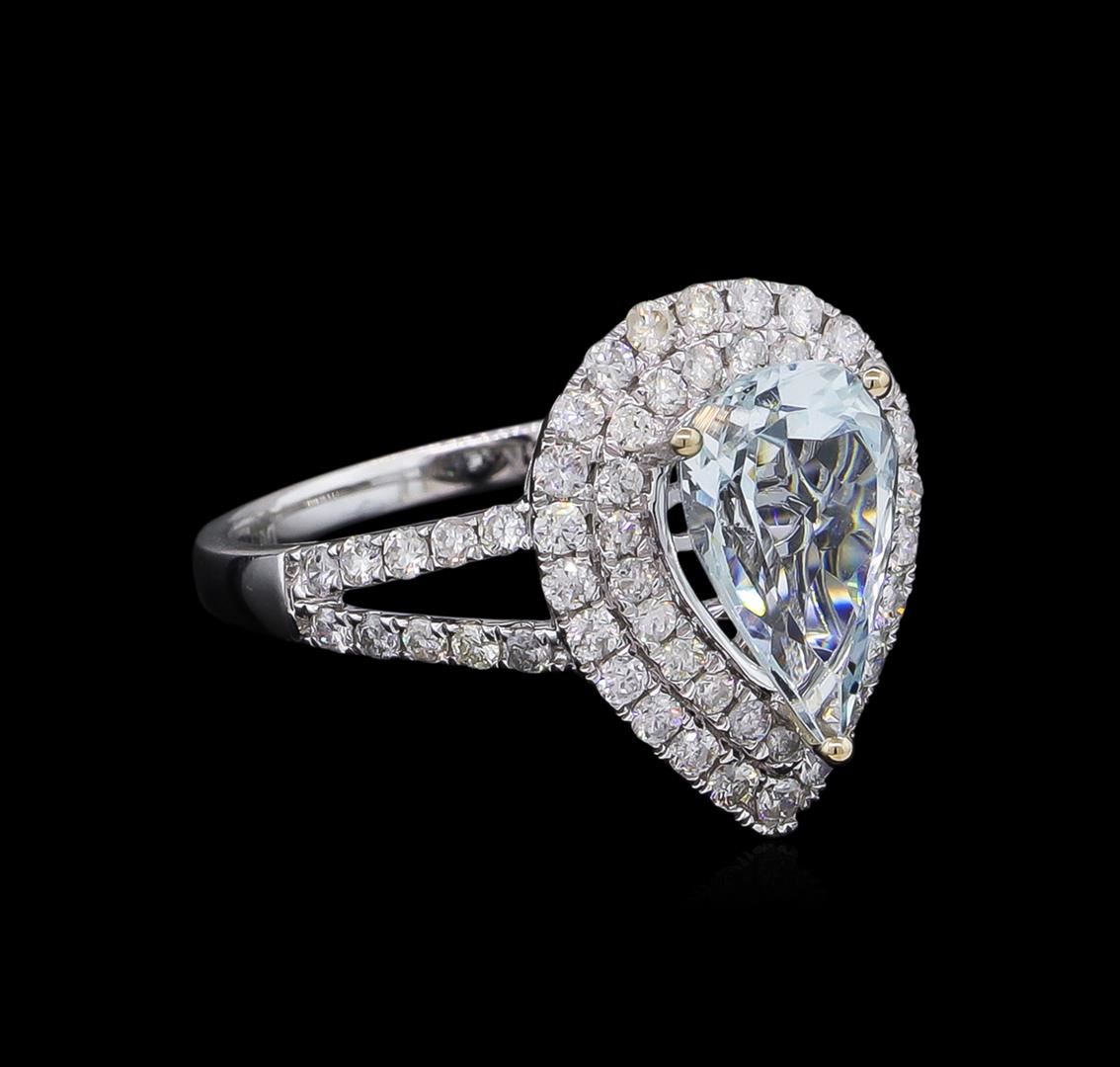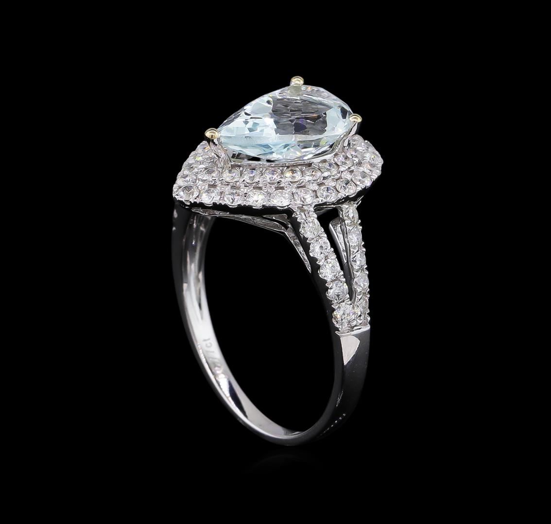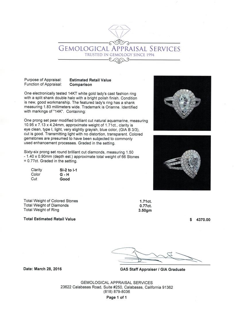 One electronically tested 14KT white gold lady's cast fashion ring with a split shank double halo with a bright polish finish. The featured lady's ring has a shank measuring 1.83 millimeters wide. Trademark is Orianne. Identified with markings of "14K". Condition is new, good workmanship. Containing: One prong set pear modified brilliant cut natural aquamarine, measuring 10.95 x 7.13 x 4.24mm, approximate weight of 1.71ct., clarity is eye clean, type I, light, very slightly grayish, blue color, (GIA B 3/3), cut is good. Transmitting light with no distortion, transparent. Colored gemstones are presumed to have been subjected to commonly used enhancement processes. Graded in the setting. Sixty-Six prong set round brilliant cut diamonds, measuring 1.50 - 1.40 x 0.90mm (depth est.) approximate total weight of 66 Stones = 0.77ct. Graded in the setting. Clarity: SI-2 to I-1. Color: G - Good. Total Weight of Colored Stones 1.71ct. Total Weight of Diamonds 0.77ct. Total Weight of Ring 3.50gm. GAS Appraised at $4,370.00.
